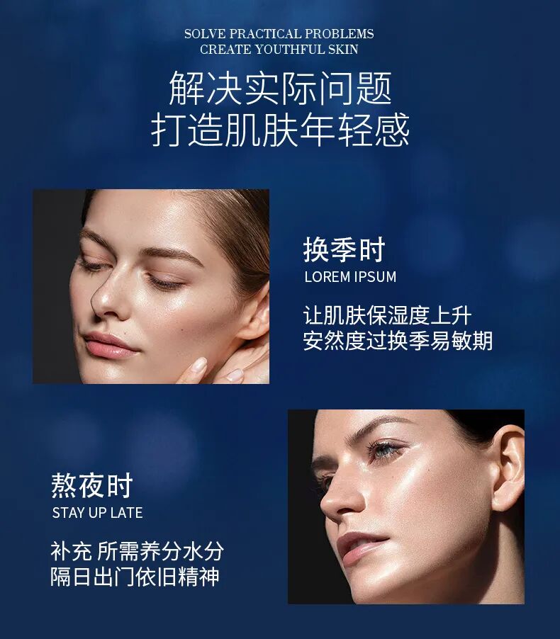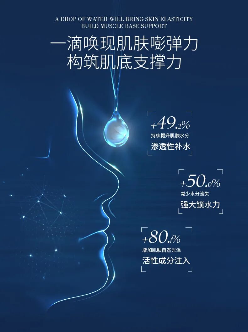 3.一滴唤现肌肤嘭弹力,构筑肌底支撑力,渗透性补充水分,持续提升肌肤49%水分,强大锁水保湿,减少50%水分流失,活性成分注入,增加肌肤80%自然光泽。