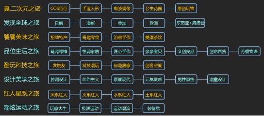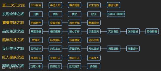 首先,可以去盘点店铺里面符合双十二特色会场的宝贝,然后报名参加特色分会场内容的浮现以及特色分会场店铺的招商,争取获得8大特色分会场资源流量。以下是8大特色线路的范畴: