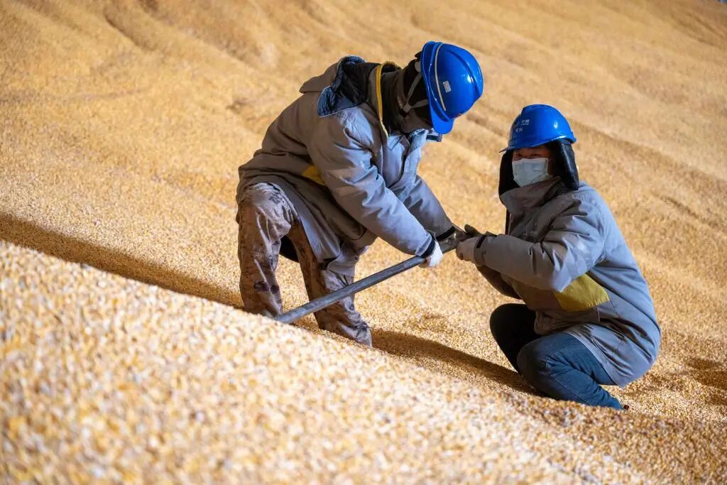 ▲2025年10月31日,在黑龙江省双鸭山市的中粮天兴物流园区仓储库,工人进行扦样作业,了解储存仓内大豆水分、杂质以及虫害等情况。