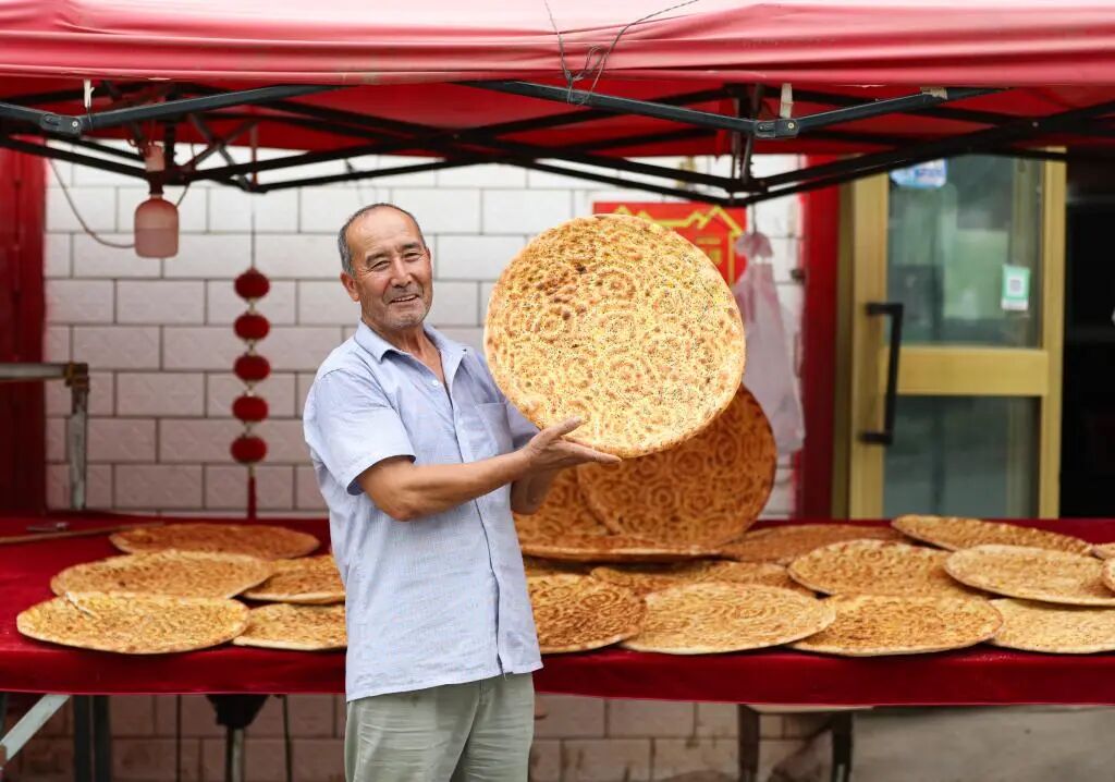 ▲2025年7月21日,在新疆库车市,传统面食制作技艺(馕制作技艺)国家级非遗代表性传承人热西提展示他制作的馕。