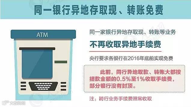 2016年12月1日,《中国人民银行关于落实个人银行账户分类管理制度的通知》正式生效,央行顺势取消同行异地存取款、转账的手续费。通过ATM机同行异地存取款、转账不再收手续费。