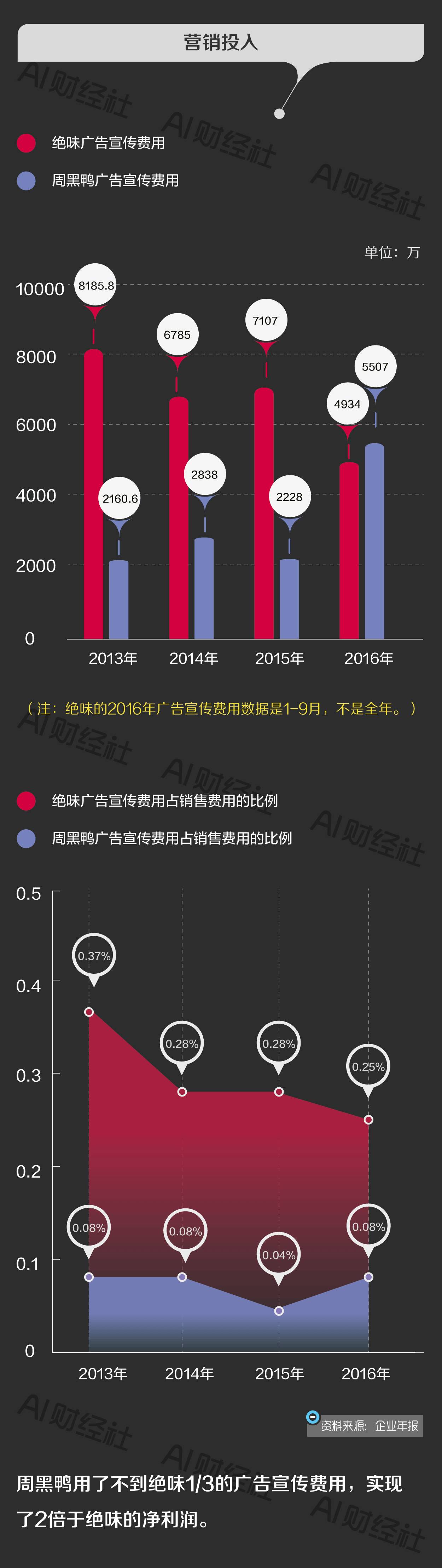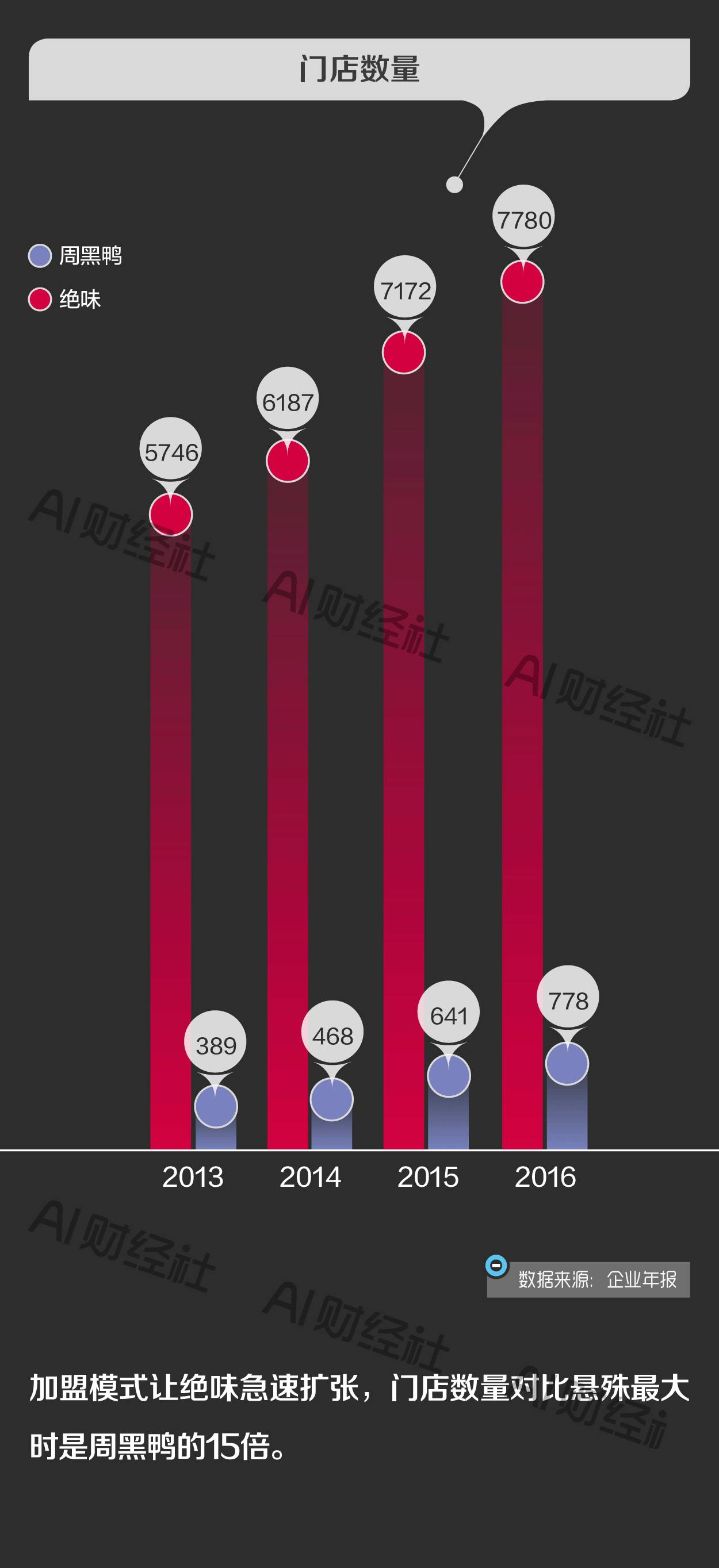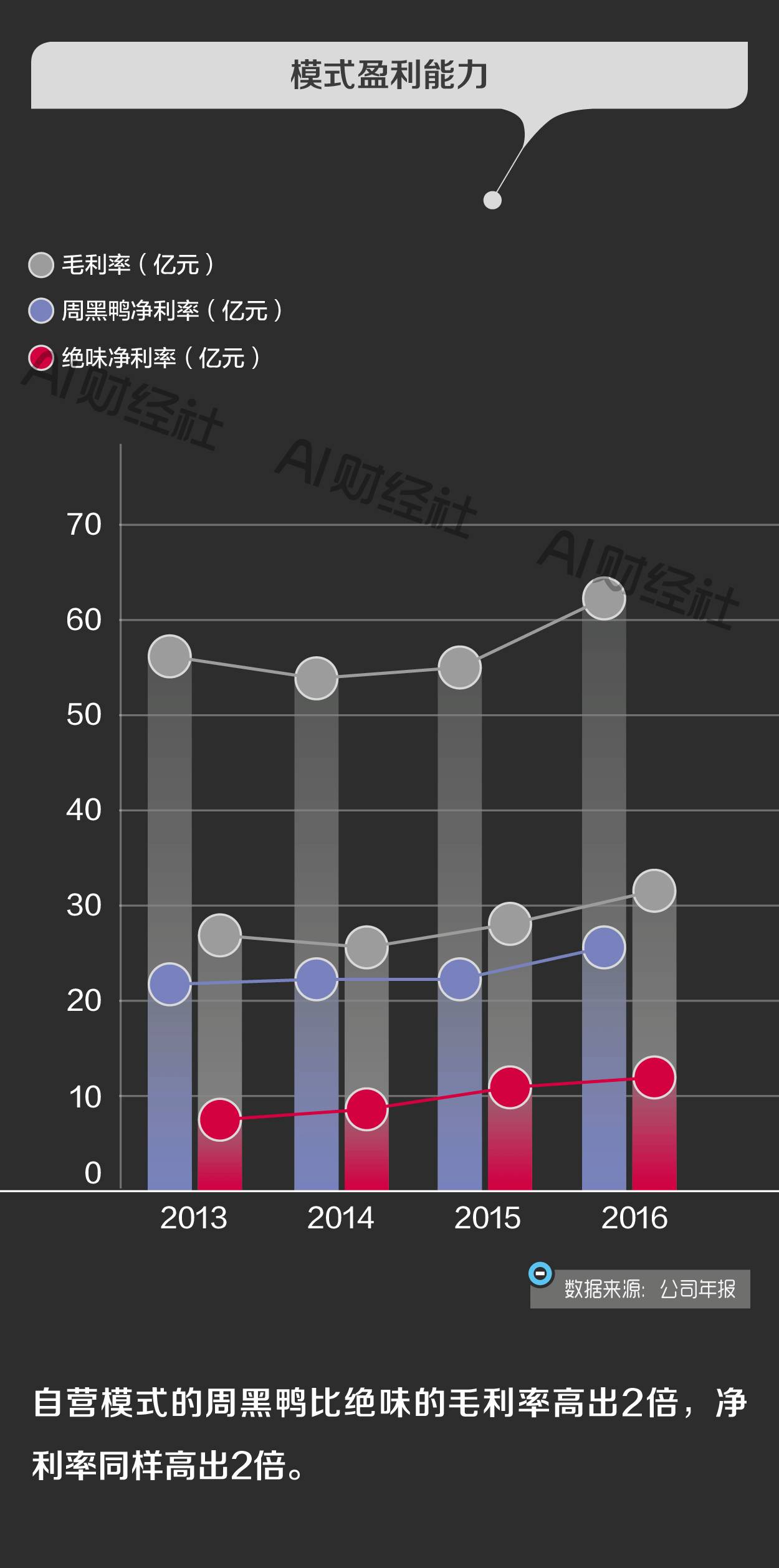 2016年,绝味的店铺数量10倍于周黑鸭,销量3倍于周黑鸭,收入也是周黑鸭的1.5倍,但利润只有周黑鸭的50%。