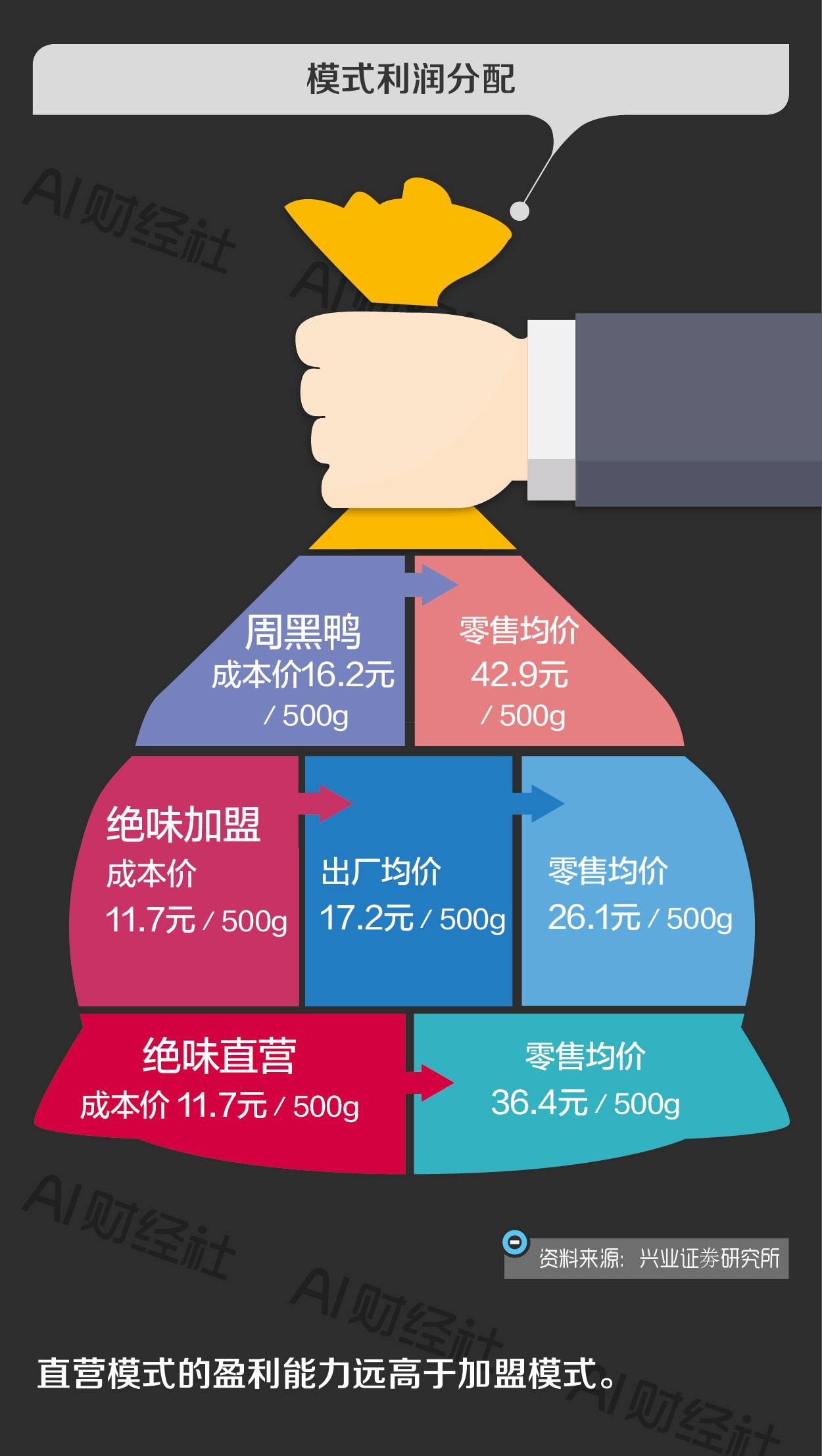 周黑鸭选择了直营,自营对商品质量和对渠道的掌控,让周黑鸭拥有了定价权的同时和忠诚的用户,同时也保证了利润。