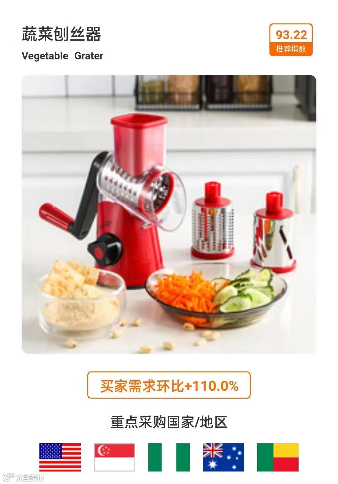 【优势产品分析】厨房工具产品形态五花八门,重点叶子类目为果蔬工具。其中蔬菜刨丝器与厨刀相比拉低操作门槛,更高效且一物多用可各种造型,主要关键词可设置:multifunctional,detachable,replaceable,adjustable,N in 1等。