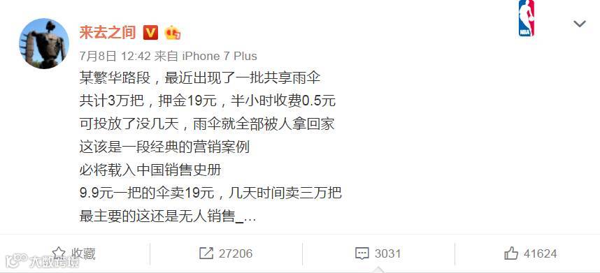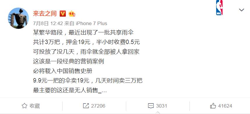 他认为,3万把共享雨伞押金19元,半小时收费0.5元,虽然投放了没几天,就全部被人拿回家,但这应该是一段经典的营销案例,必将载入中国销售史册。
