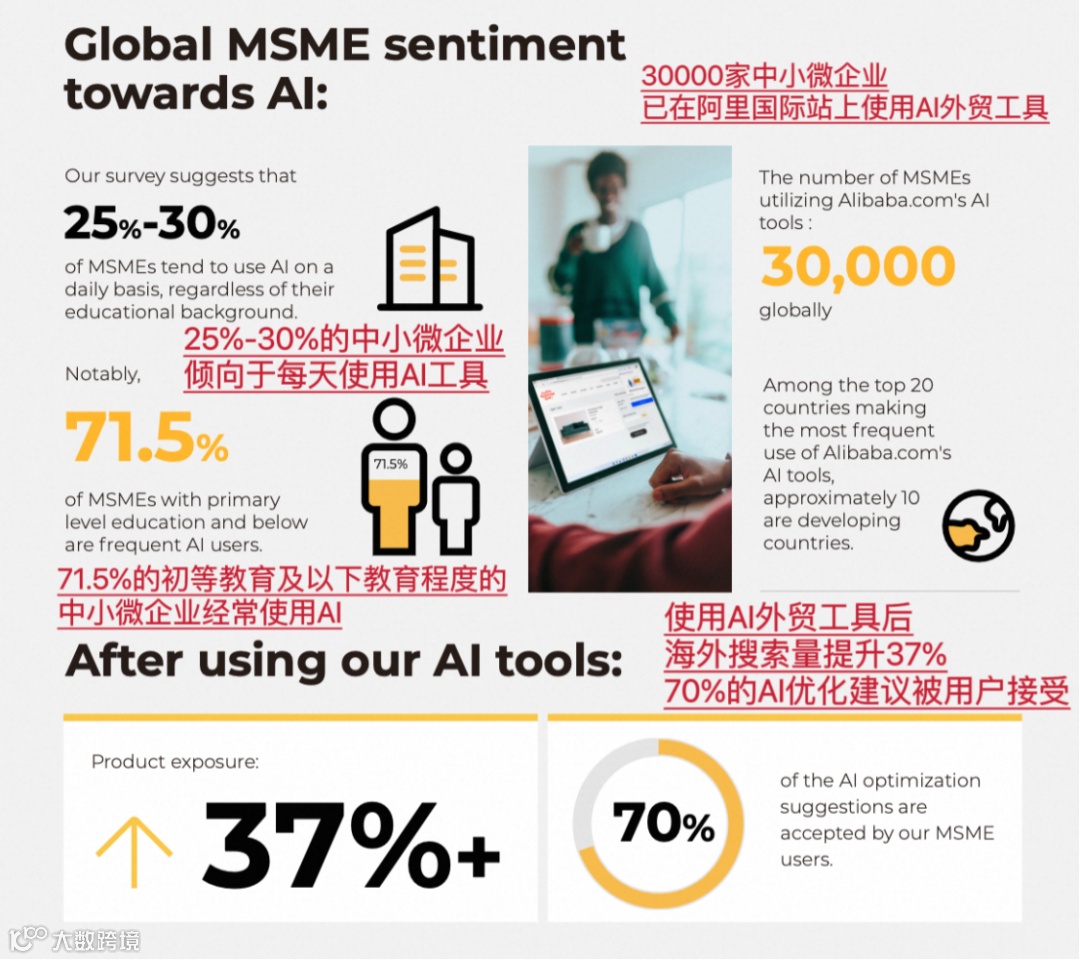 根据阿里国际站发布的《中小微企业日报告》,在全球范围内,25%-30%的中小微企业已经在日常使用AI,尤其值得注意的是,71.5%的初等及以下教育程度的中小微企业经常使用AI。