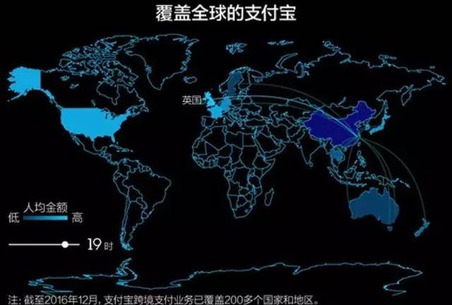 截至目前,支付宝跨境支付已经覆盖了全球200多个国家和地区。成为了名副其实的全球付,为世界打开了无现金的大门。阿里巴巴也成为了世界第一大贸易中心,一个移动的世界银行!