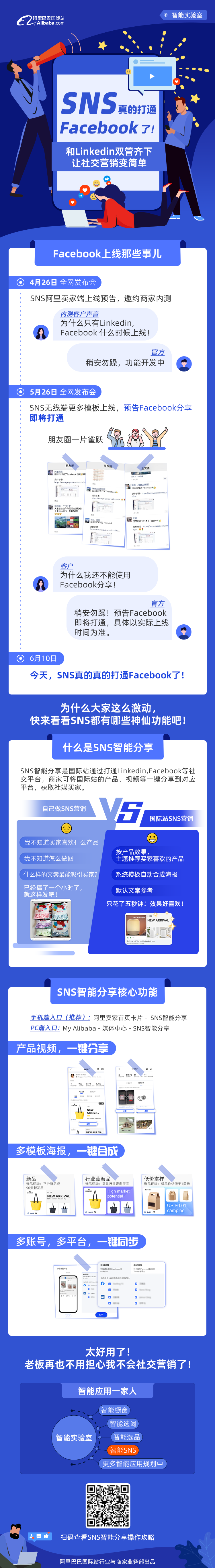 导读:Facebook24亿月活用户,现在国际站SNS智能分享打通Facebook了!商家可以将国际站的内容一键分享到第三方社交媒体平台,用高质量的内容吸引社媒新买家。
