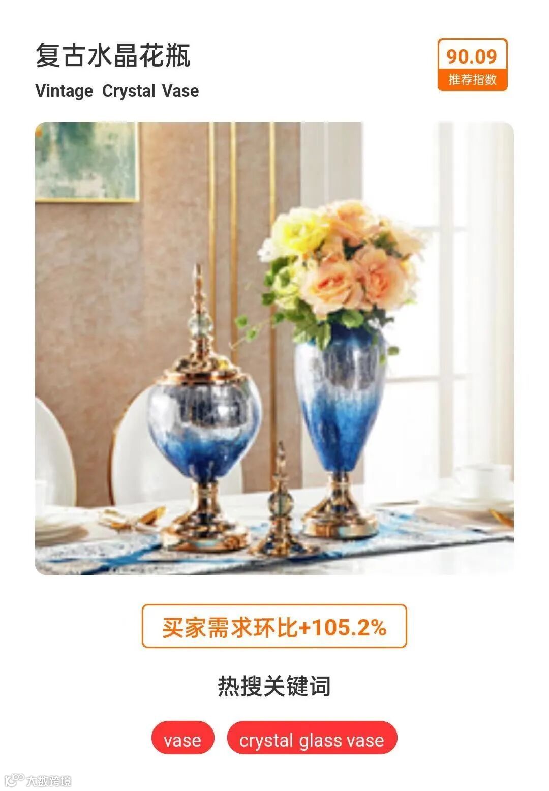 【优势产品分析】人们注重居家生活品质,干花装饰从2020年开始,成为亚马逊、Ins KOL的爆卖,同时拉动了相关类目——花瓶的需求增长,复古纹理或复古色,更能反映出历史文化的沉淀感,因此越来越受海外年轻人喜爱。