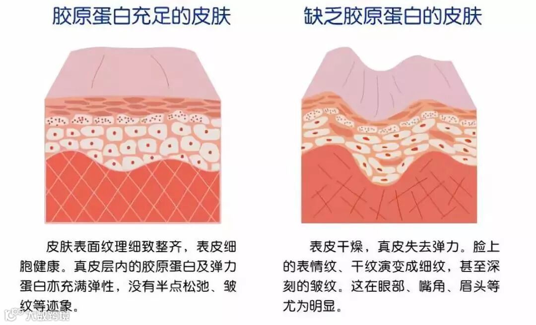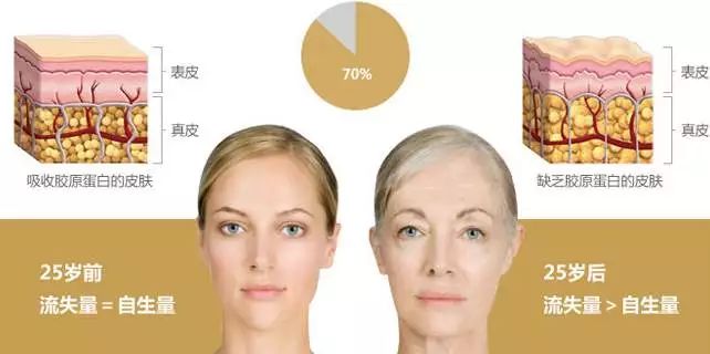 随着年龄增长,皮肤真皮层里的胶原蛋白进入流失高峰期。(每年以1%的加速度递增)。