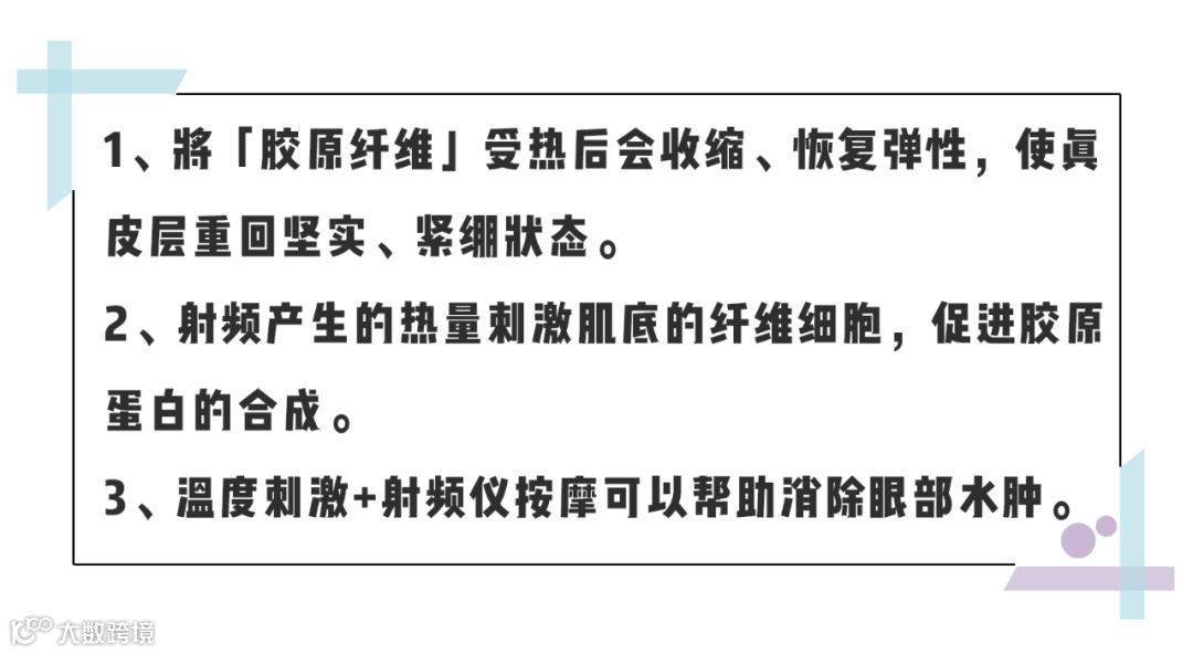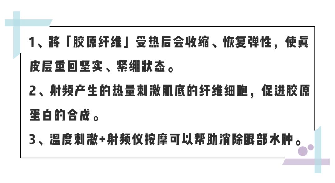 简单来讲,它的原理就是利用RF射频和微电流,刺激眼部胶原蛋白和锻炼眼部肌肉,达到嫩肤和抗皱效果。