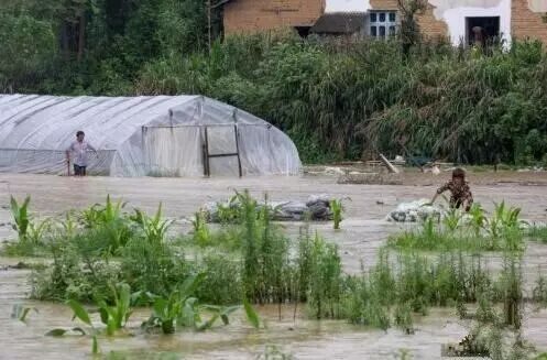 7月3日,在江西武宁县清江乡,暴雨导致山洪暴发,洪水浸没了大片农田、道路和村庄。