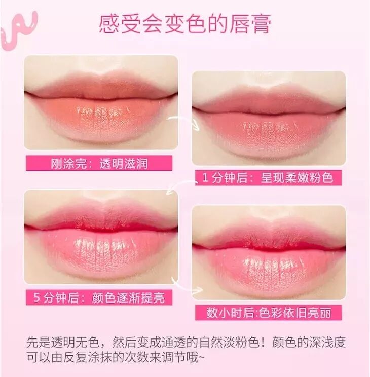 首先它具备一支好润唇膏最基本的素质:保湿、滋润、不油、不黏腻。在这个基础上,它加入了一点点小心机,那就是智能感温变色!