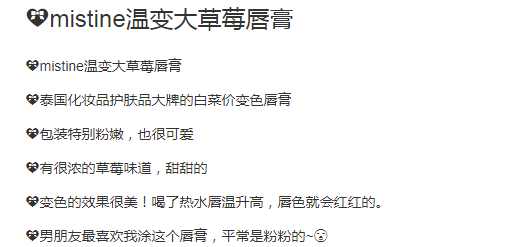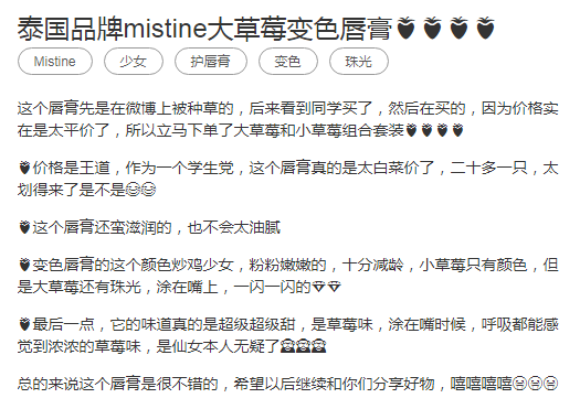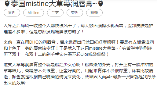 Mistine是泰国数一数二知名的牌子,这款草莓唇膏就是他们家的“明星产品”,光是粉粉的包装就已经很吸引我的心了!