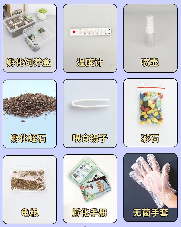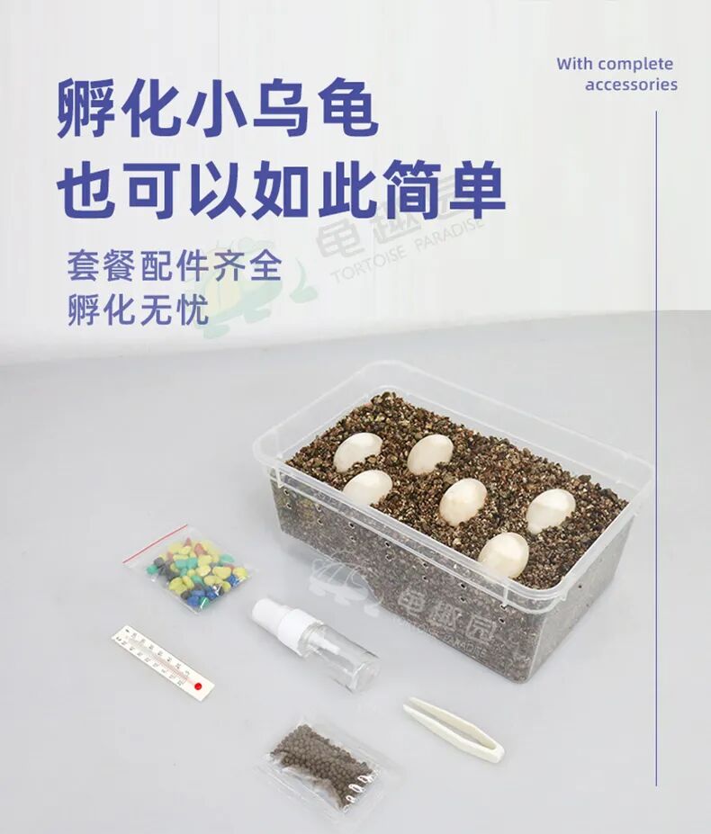 配套商品:喷壶、镊子、孵化盒、秘制龟粮,温度计、五彩石、蛭石,手套、孵化手册