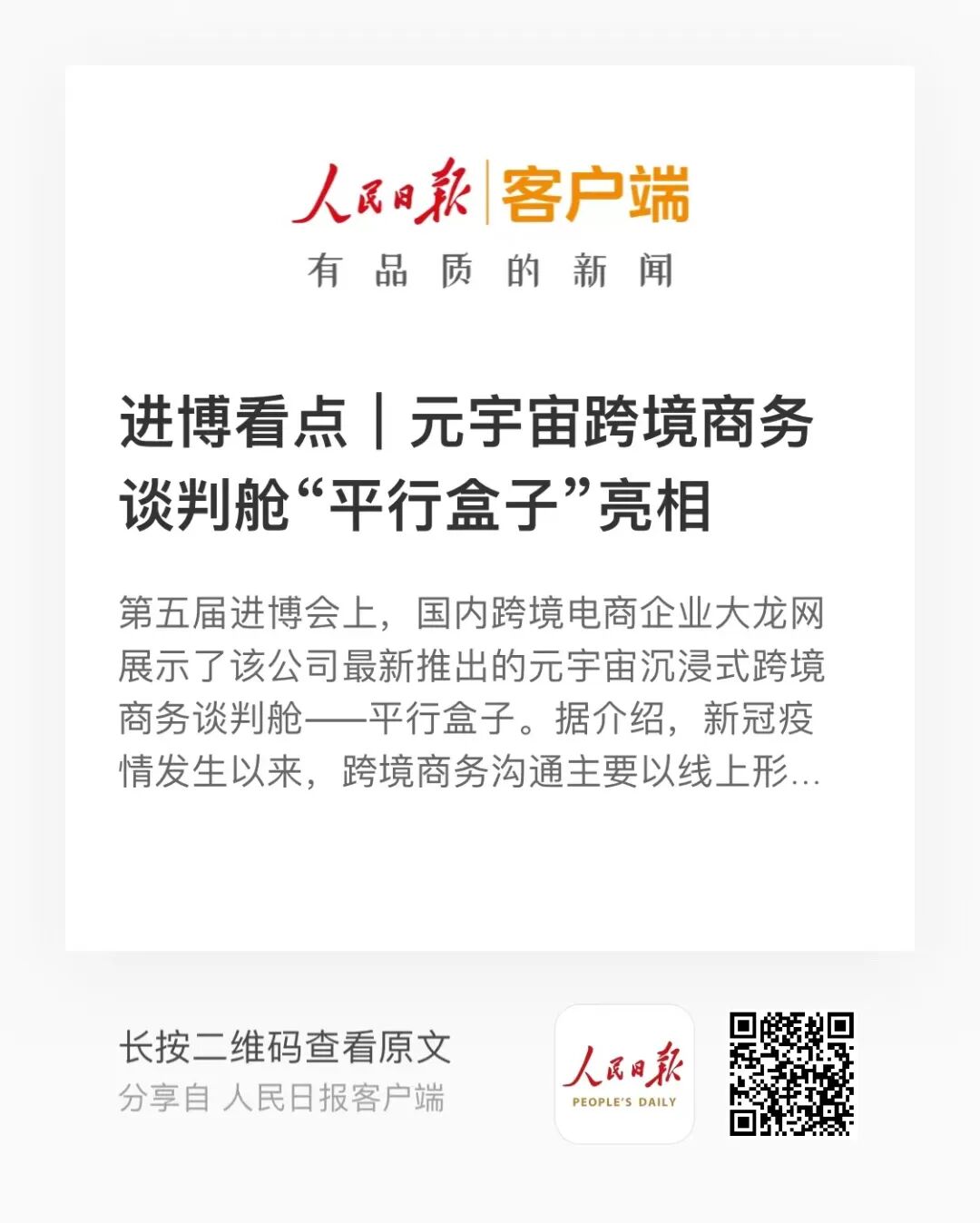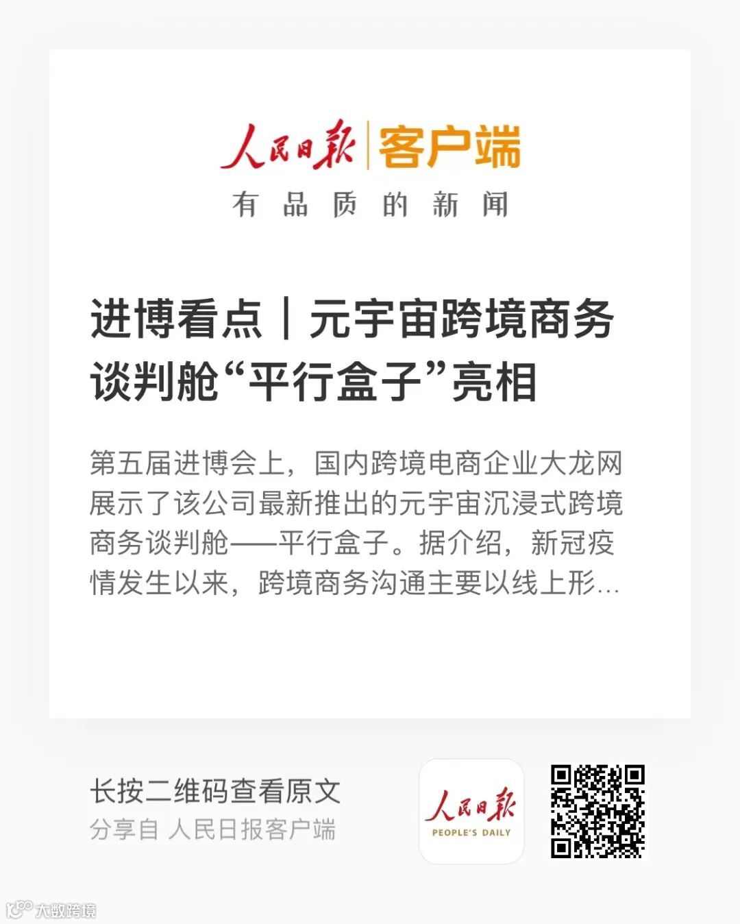 第五届进博会上,国内跨境电商企业大龙网展示了该公司最新推出的元宇宙沉浸式跨境商务谈判舱——平行盒子。