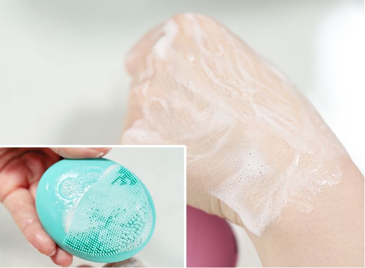挤出适量洗面奶在洗脸仪上,开启开关,轻轻在脸上打圈按摩。