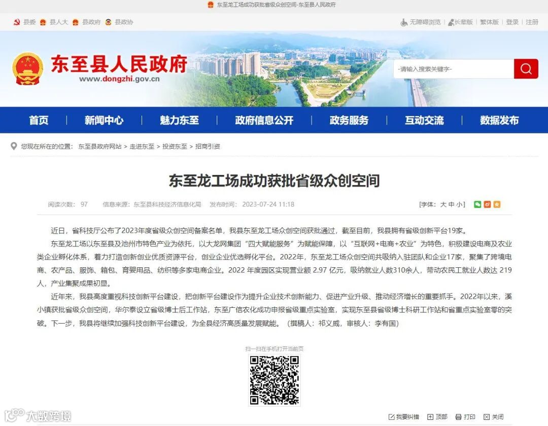 近日,安徽省科技厅公布了2023年度省级众创空间备案名单,大龙网集团旗下东至龙工场跨境电商产业园(以下简称东至龙工场)成功获批。这是继2021年被认定为“安徽省省级跨境电子商务产业园区”以来,东至龙工场获得的又一省级荣誉。