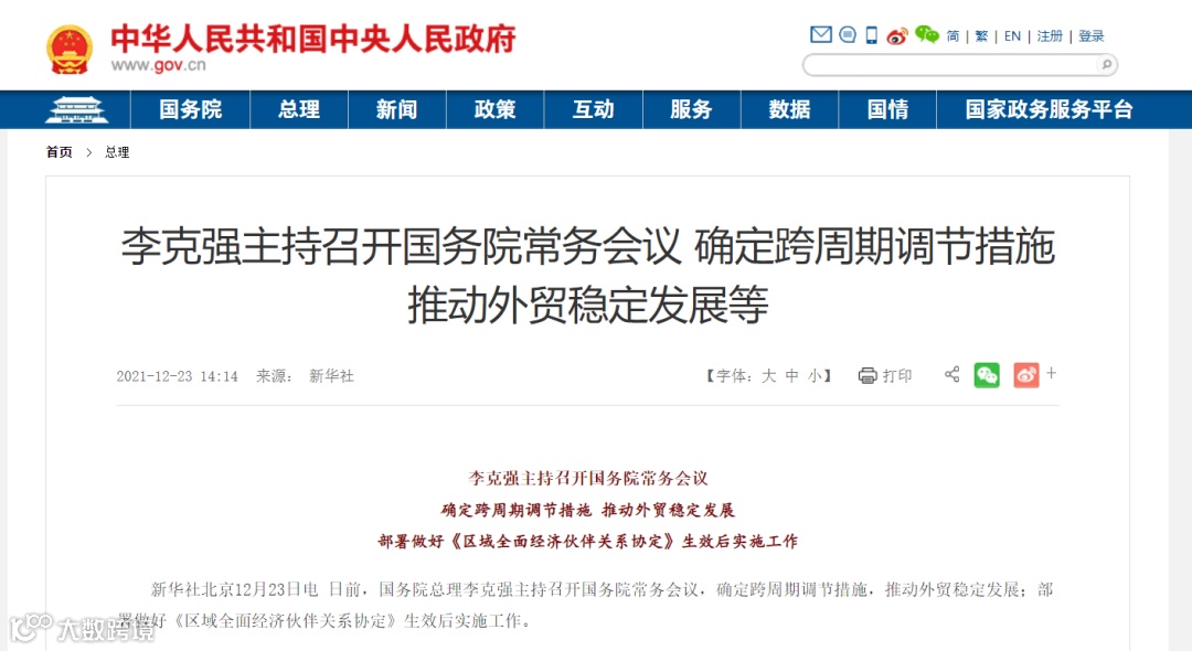 国务院总理李克强主持召开国务院常务会议,确定跨周期调节措施,推动外贸稳定发展;部署做好《区域全面经济伙伴关系协定》生效后实施工作。