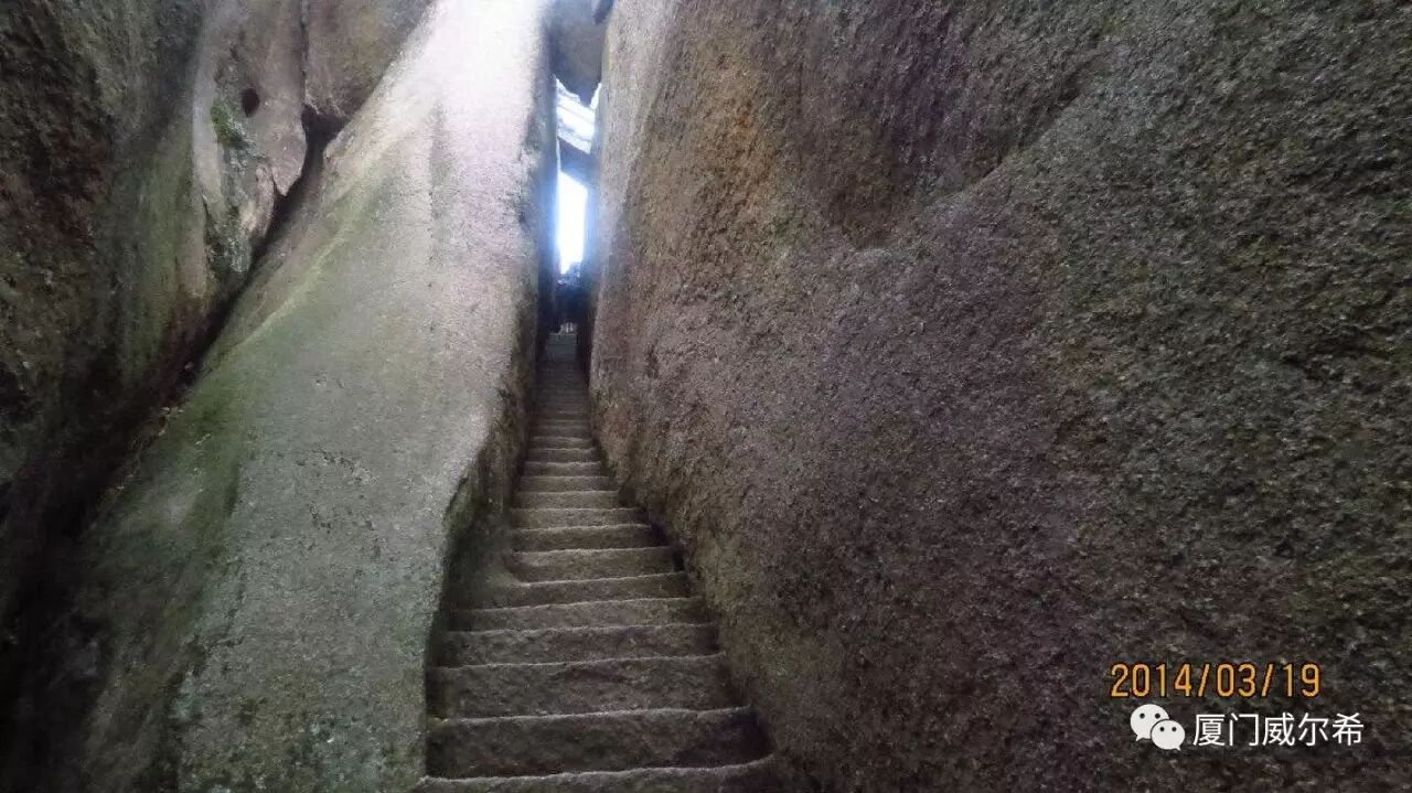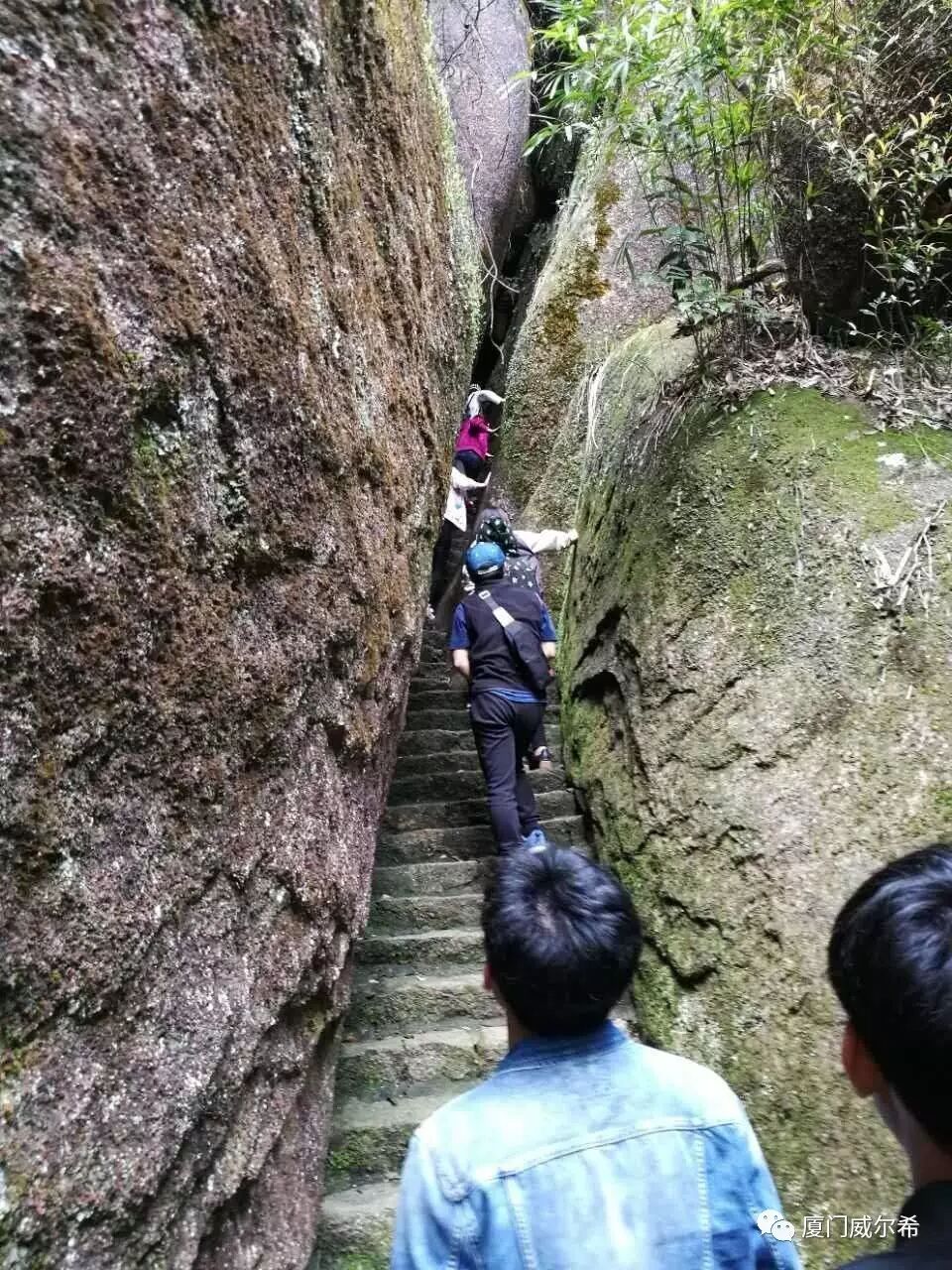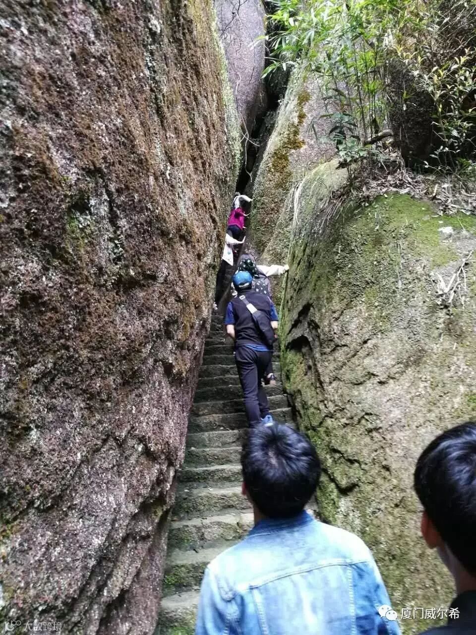 我们随着歌谣,顺着石梯,来到了太姥山中的“一线天”。要闯“一线天”必须做好五个锻炼。一、俯卧撑;二、侧身走;二、弯腰行;四、平衡过……