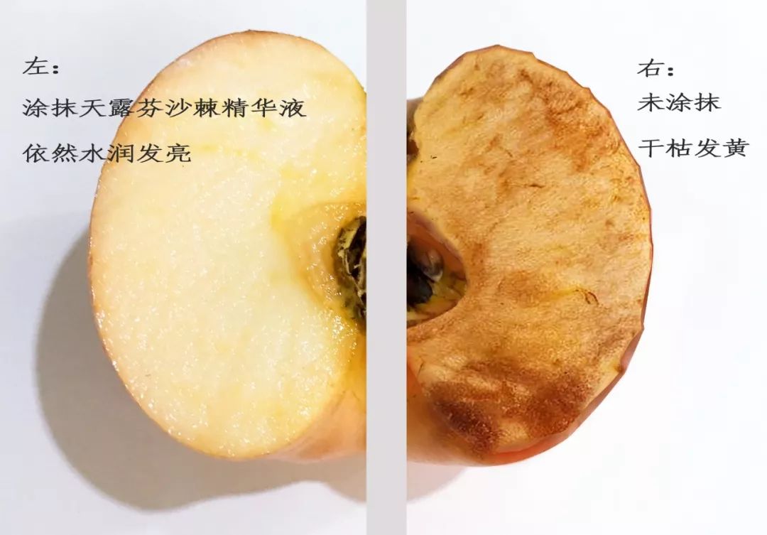 ▼切开的苹果,左边涂抹了精华液的苹果依然润泽白亮,右边未涂抹的苹果已经凸显枯干和黄色。