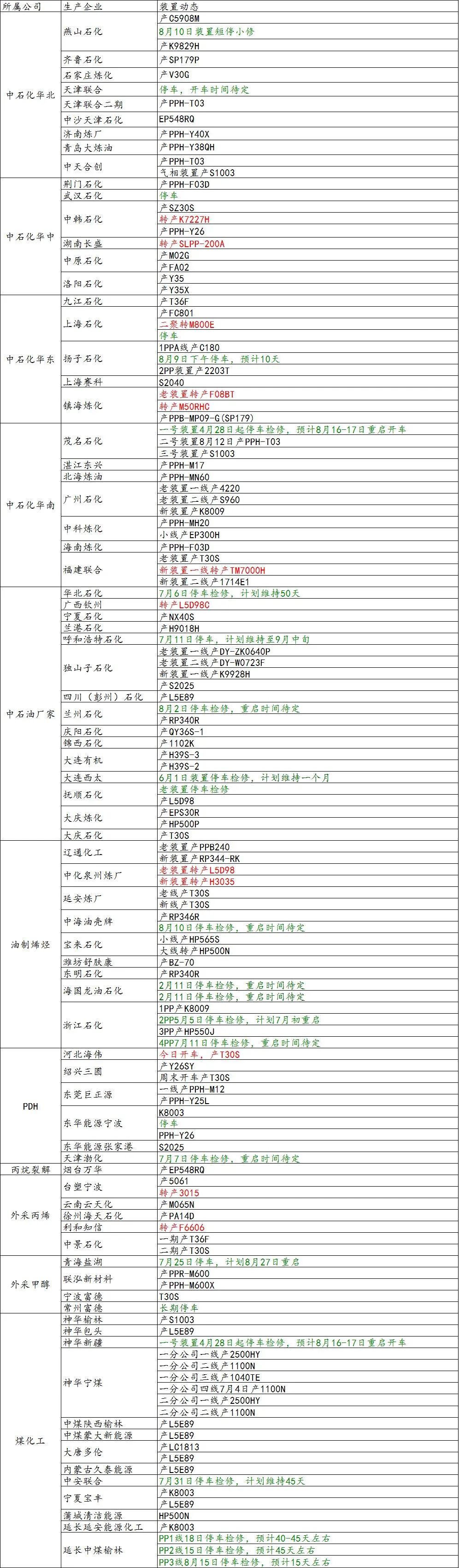 导读:8月15日国内装置动态