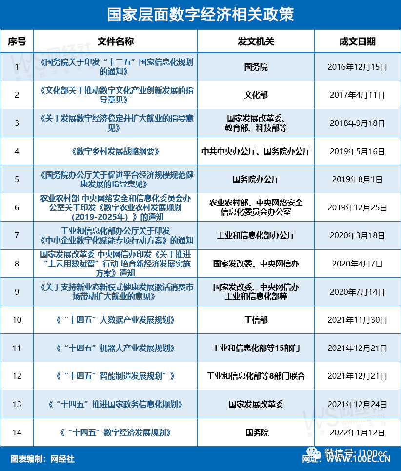 据“一带一路”TOP10影响力社会智库网经社电子商务研究中心监测显示,2019年以来,国家层面陆续出台《国家数字经济创新发展试验区实施方案》《关于构建更加完善的要素配置体制机制的意见》等数字经济领域顶层设计。2021年国家“十四五”《规划纲要》中明确提出“发展数字经济,推进产业数字化和数字产业化,推动数字经济与实体经济深度融合”,从各领域、多维度为数字经济发展提供了政策支撑。
