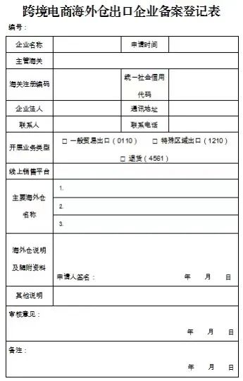 《跨境电商海外仓出口企业备案登记表》(简称《备案登记表》)及《跨境电商海外仓信息登记表》(简称《海外仓登记表》,一仓一表)一式一份;