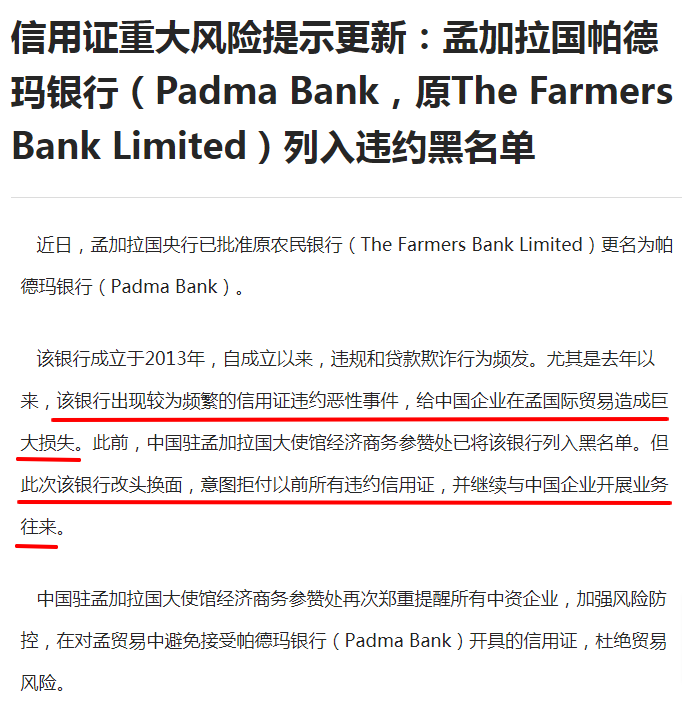 出口方联系上我国大使馆,才发现孟加拉的这家银行在银行黑名单排第一位。此时要回货款的概率已经很低、很低了。