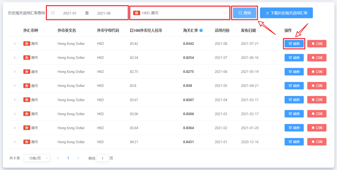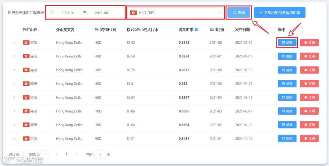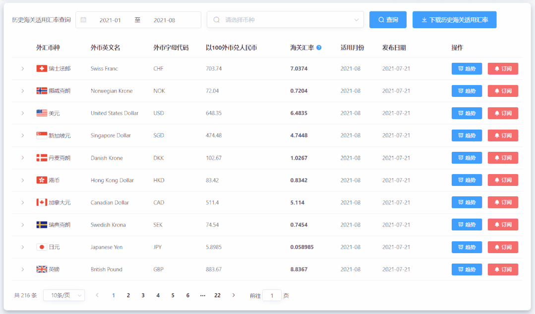 点击选择需要查询【时间范围】,选择【币种】,点击【查询】按钮,查询该币种历史海关适用汇率。点击【下载历史海关适用汇率】按钮,可批量下载导出历史海关适用汇率。