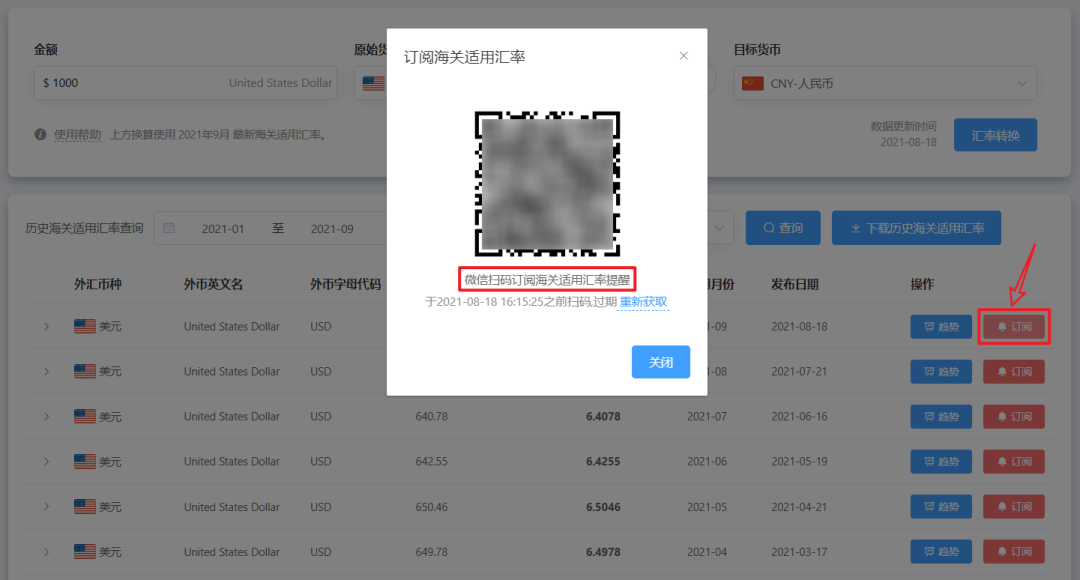 点击【订阅】按钮,微信扫码订阅,实时获取海关适用汇率最新变化通知。