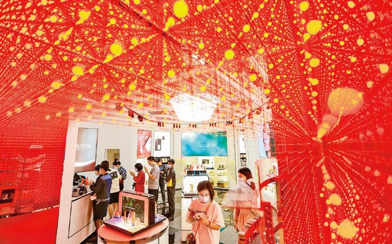 中国市场是世界的市场、共享的市场、大家的市场。2021年5月,首届中国国际消费品博览会在海南举办,有利于世界各国共享中国市场机遇,有利于世界经济复苏和增长,也有利于中国为世界提供更多优质消费品。图为2021年10月30日,在位于海南省海口市日月广场的海控全球精品免税城,游客在选购免税商品。 求是图片 王程龙/摄