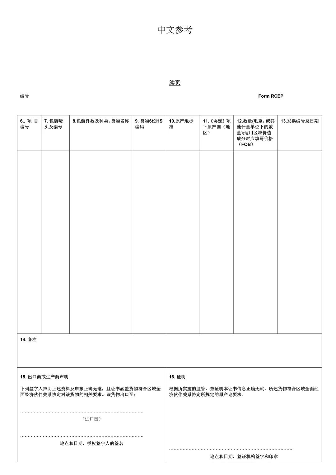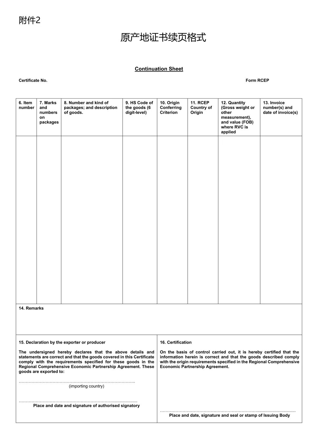 二、海关总署公告2021年第106号第八条所述原产地证书格式增加原产地证书续页格式(见附件2)。原产地证书所载内容无法在首页内完整列明的,出口成员方签证机构可通过续页补充列明。