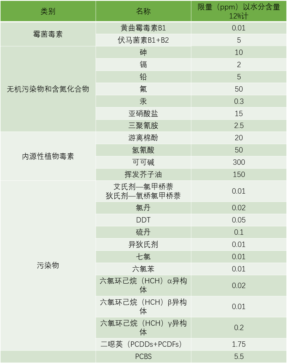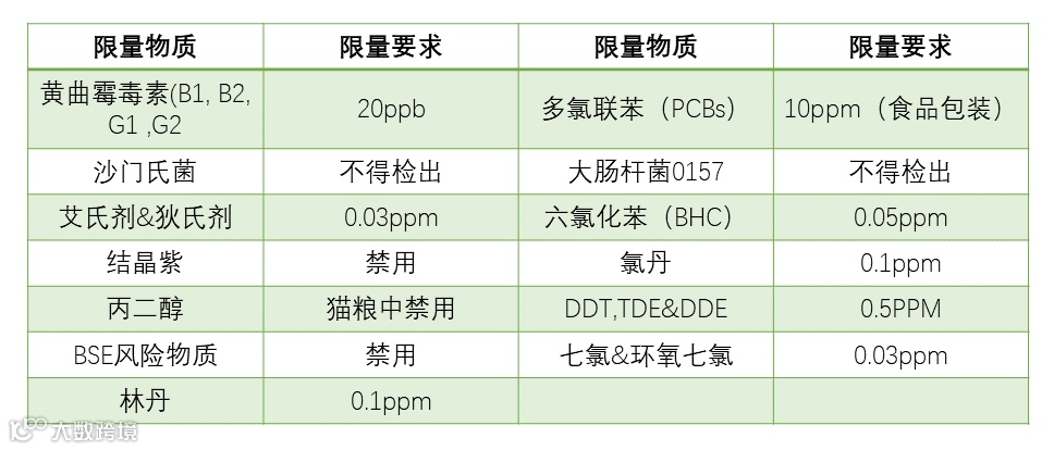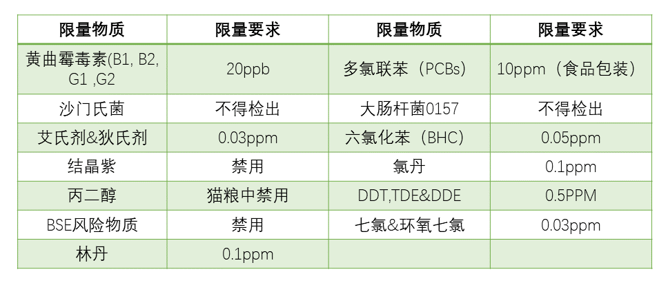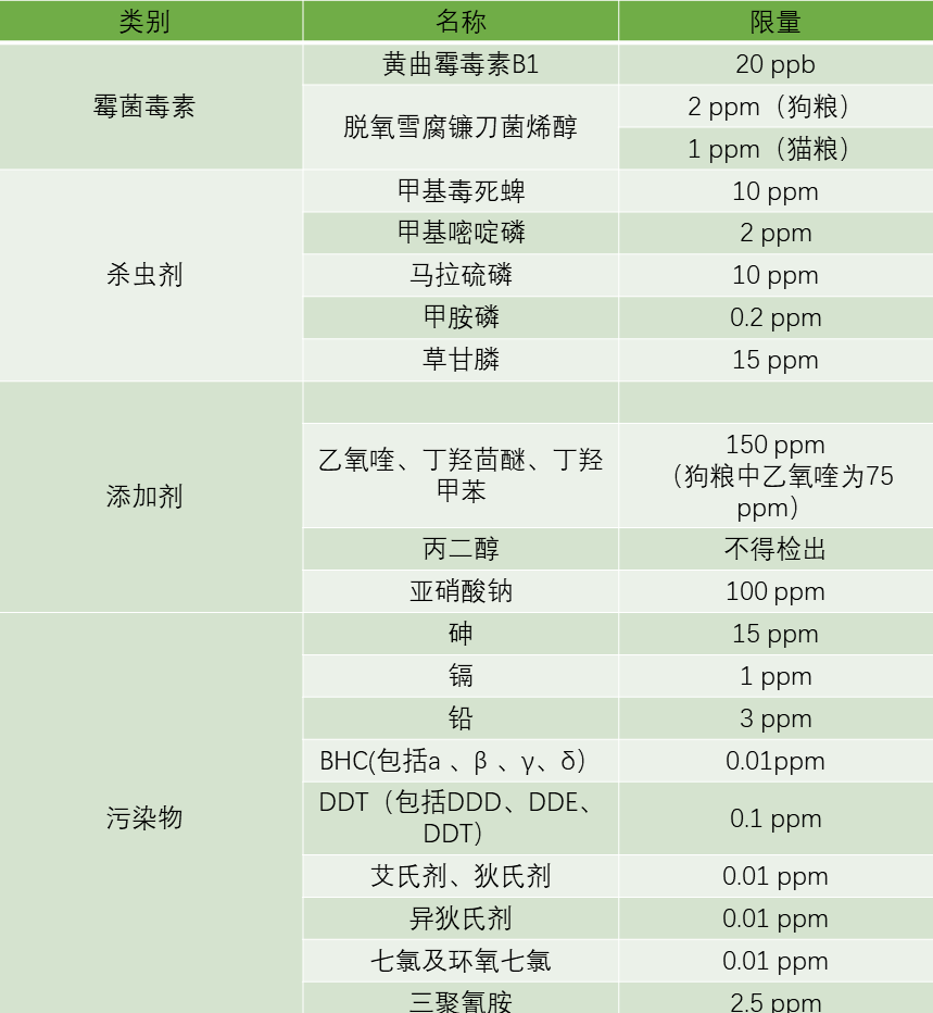 我国农业农村部于2018年制定并实施了《宠物饲料管理办法》《宠物饲料生产企业许可条件》《宠物饲料标签规定》《宠物饲料卫生规定》《宠物配合饲料生产许可申报材料要求》《宠物添加剂预混合饲料生产许可申报材料要求》等规范性文件,对宠物饲料的生产、卫生要求做了规定。其中卫生指标限量要求如下: