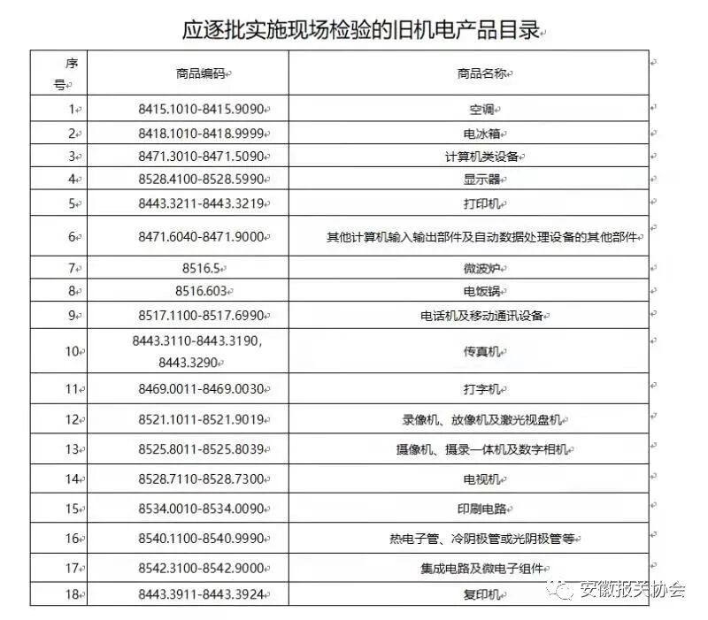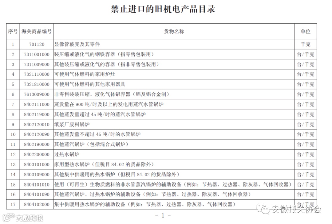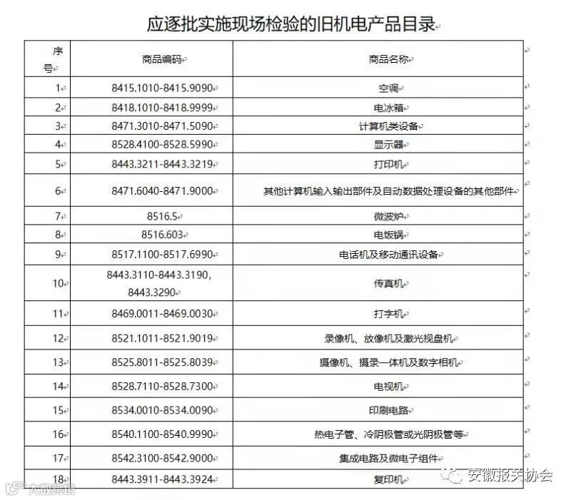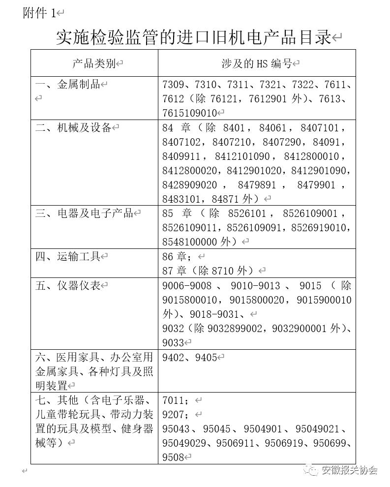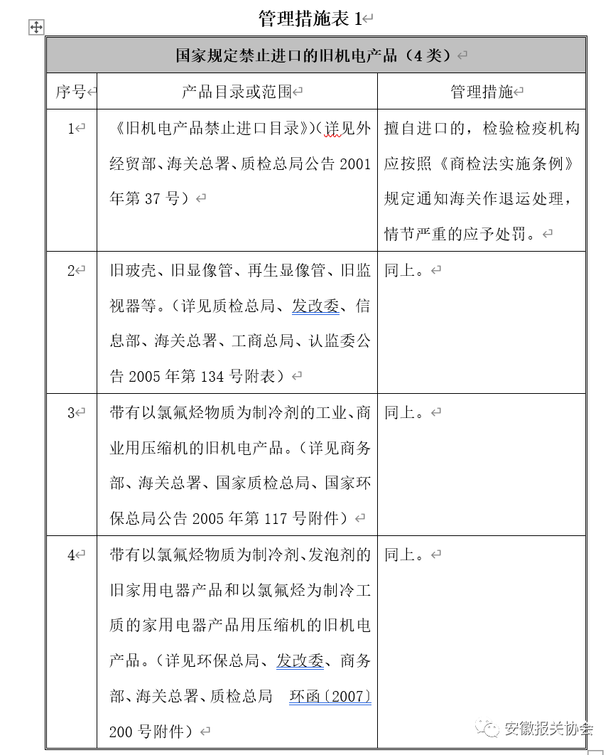商务部海关总署2018年第106号《公布禁止进口的旧机电产品目录调整有关事项》,公布了《禁止进口旧机电产品目录》,至此原质检总局公布的《检验监管措施清单》管理措施表1第1项的产品范围进行了调整,列入目录内的旧机电产品禁止进口。