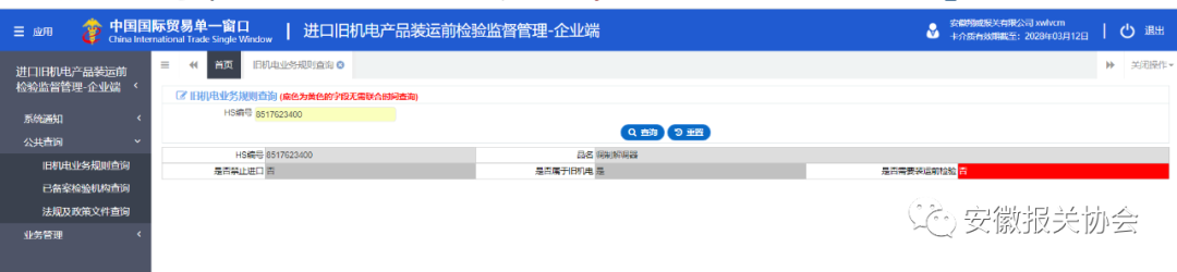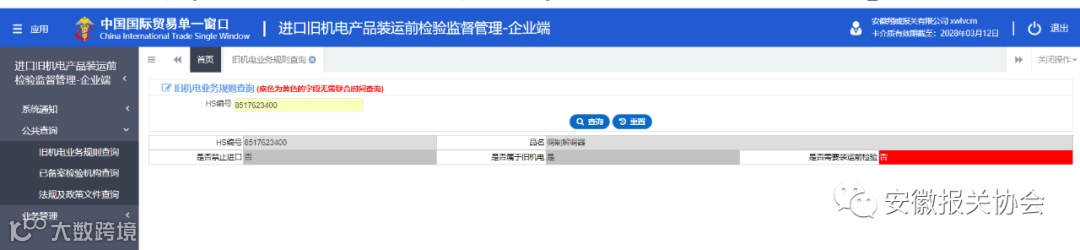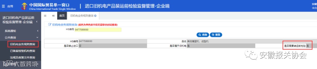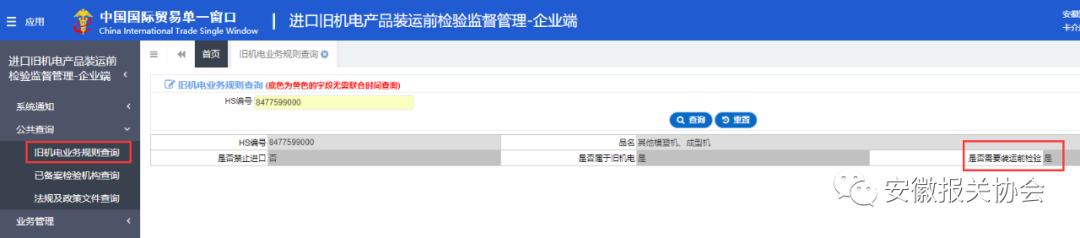 查询方法:标准版应用→检验检疫→进口旧机电产品装运前检验监督管理→委托企业入口→公共查询→旧机电业务规则查询。输入十位商品编码点击查询,单一窗口查询截图如下: