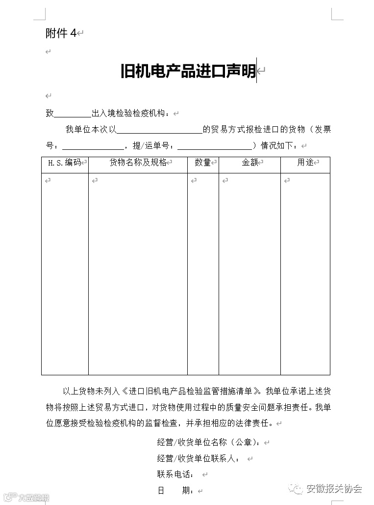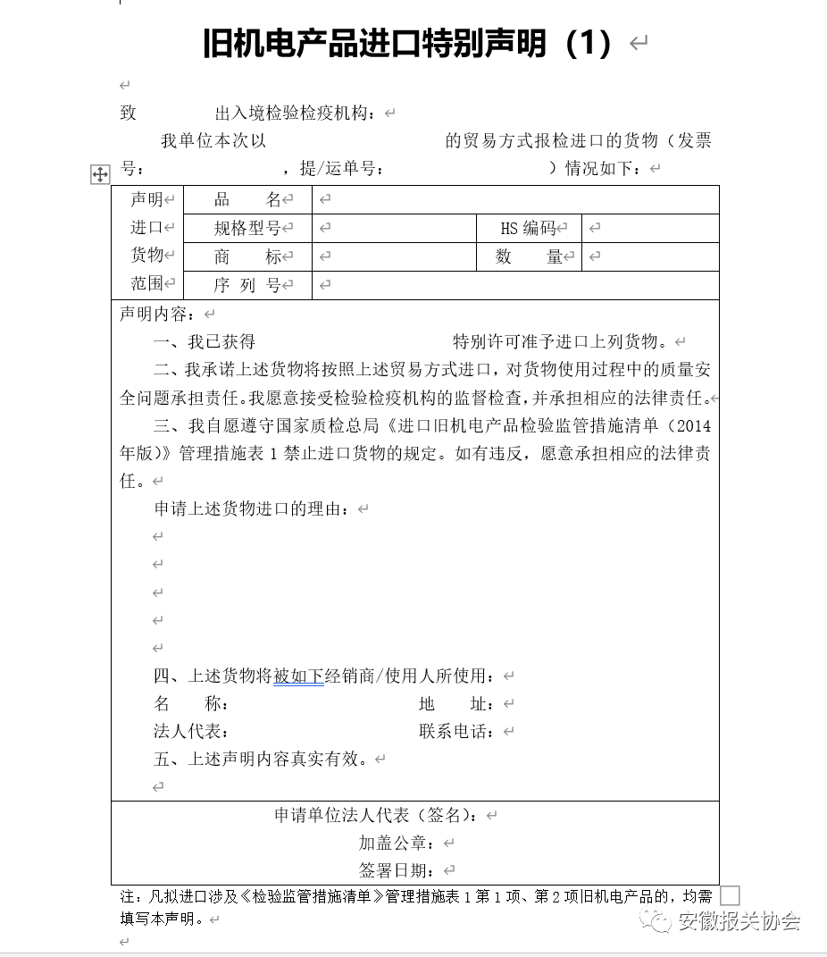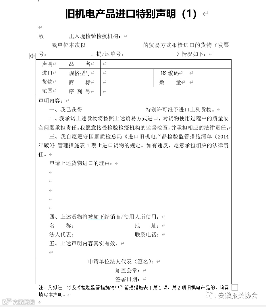 列入原质检总局2014年公布的《检验监管措施清单》管理措施表1第1项(即《禁止进口机电产品目录》)、第2项内,但经国家特别许可的旧机电产品进口时,收用货单位凭《旧机电产品进口特别声明(1)》及相关必备材料向海关申报。