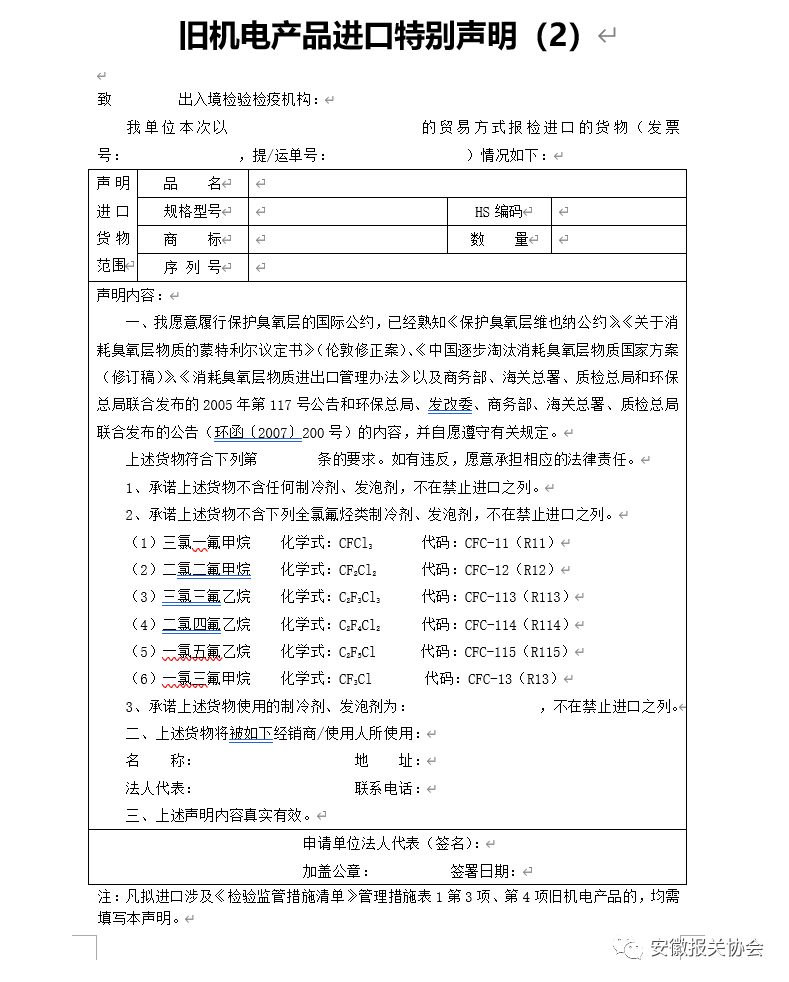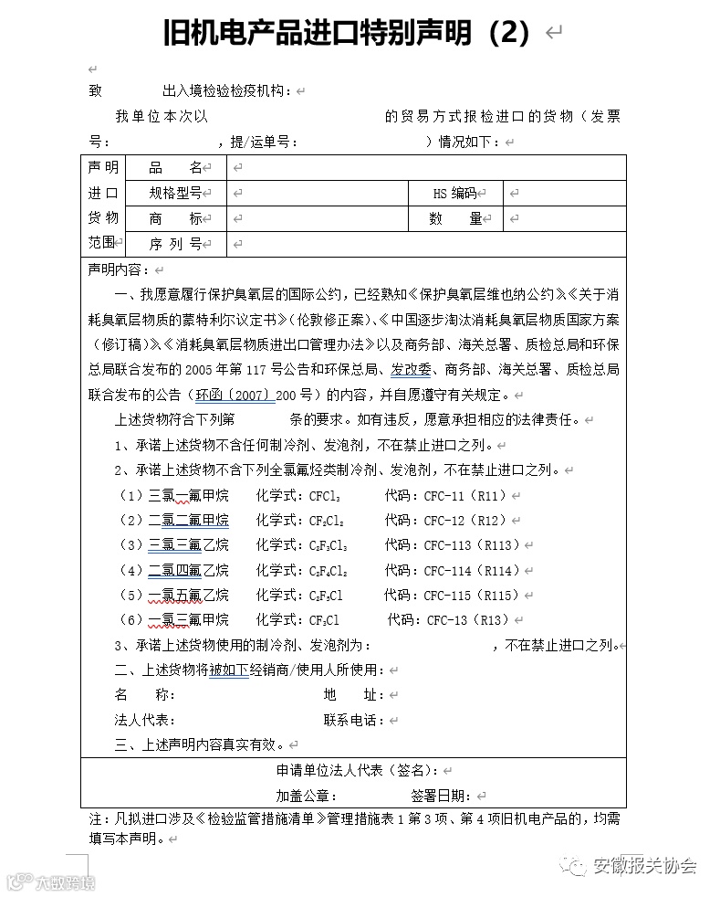 列入《检验监管措施清单》管理措施表1第3项、第4项内,但制冷介质为非氟氯烃物质(CFCs)的旧机电产品进口时,收用货单位凭《旧机电产品进口特别声明(2)》及相关必备材料向海关申报。