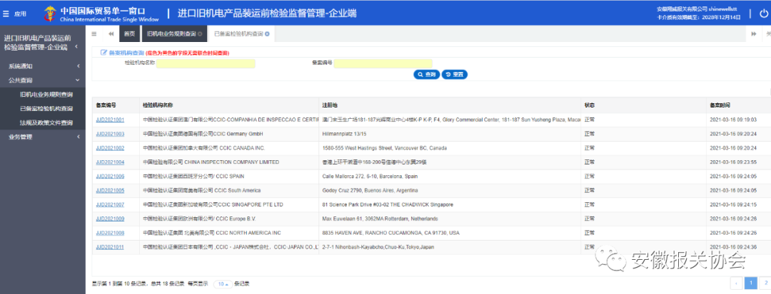海关总署对从事进口旧机电产品装运前检验的第三方检验机构实施备案管理,只有经过备案的第三方检验机构才能从事装运前检验工作,可通过国际贸易单一窗口查询经海关总署备案的检验机构名单,如下: