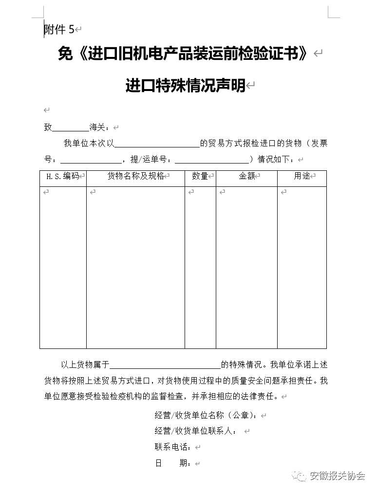 需装运前检验的旧机电产品且属于“出境维修复进口”、“暂时出口复进口”、“出口退货复进口”、“国内转移复进口”4种特殊情况旧机电产品进口时,免于装运前检验。收、用货单位凭《免<进口旧机电产品装运前检验证书>进口特殊情况声明》及相关必备材料向海关申报。