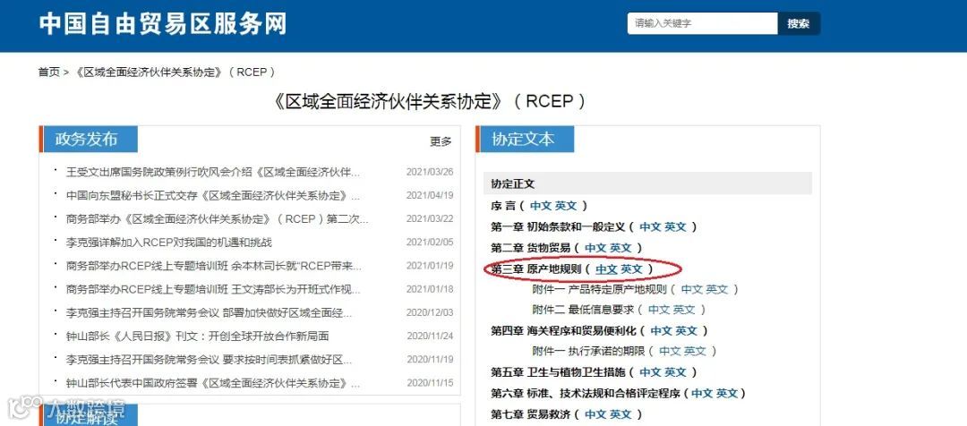 RCEP协定原产地规则同样可以通过中国自由贸易区服务网(http://fta.mofcom.gov.cn)可查询到。