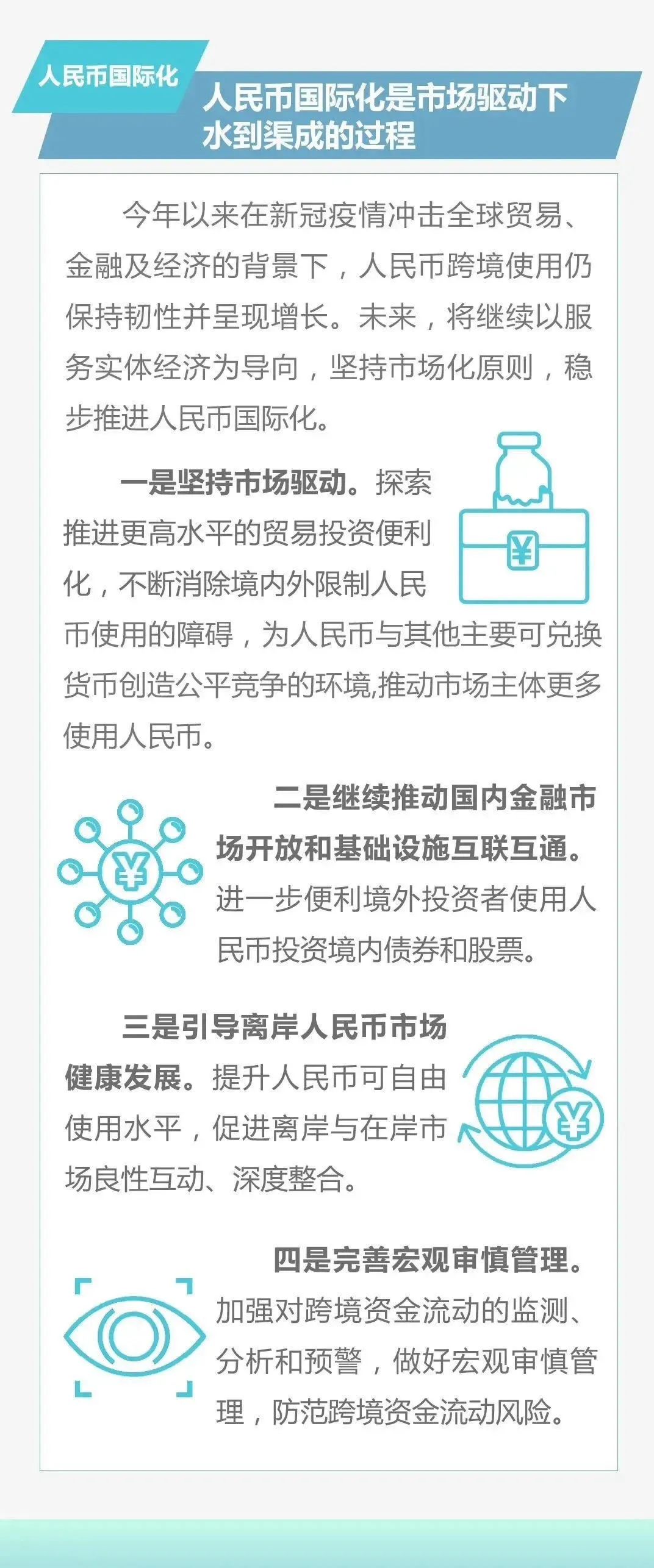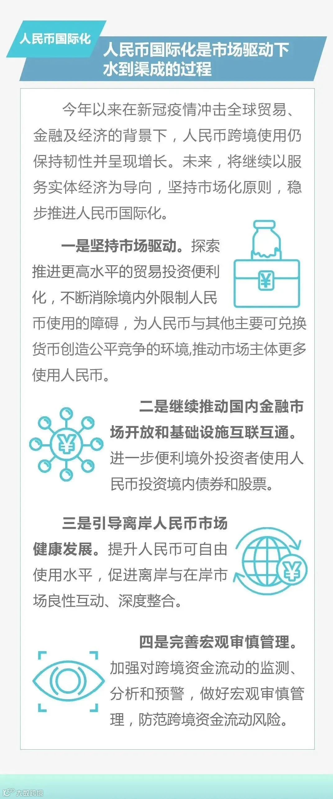 人民币国际化是市场驱动下水到渠成的过程。近年来,人民币跨境使用保持快 速增长,特别是今年以来在新冠疫情冲击全球贸易、金融及经济的背景下, 人民币跨境使用仍保持韧性并呈现增长。央行表示,未来将继续以服务实体经济为导向,坚持市场化原则,稳步推进人民币国际化。