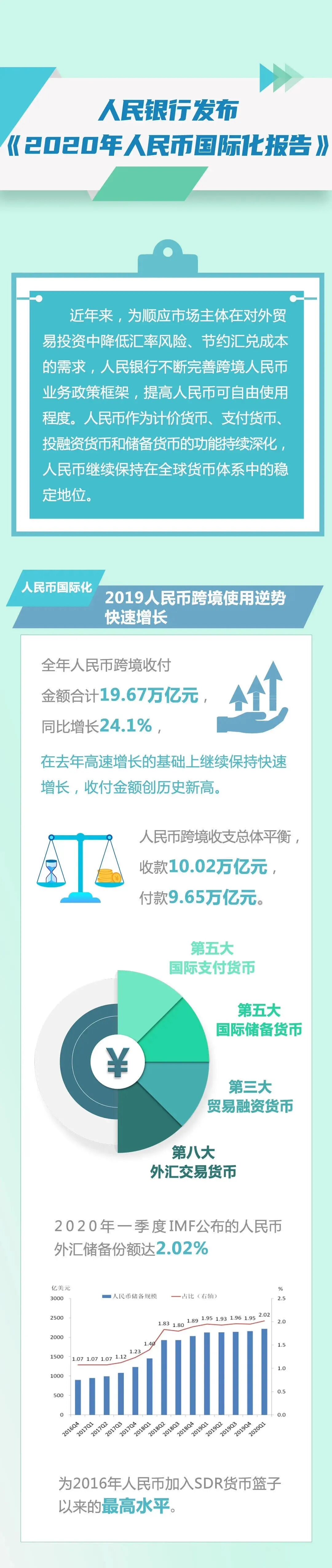2019年全年人民币跨境收付金额合计19.67万亿元,同比增长24.1%。净流入3606亿元,2018年为净流入1544亿元。人民币跨境收付占同期本外币跨境收付总金额的比重为38.1%,创历史新高,较上年提高5.5个百分点。