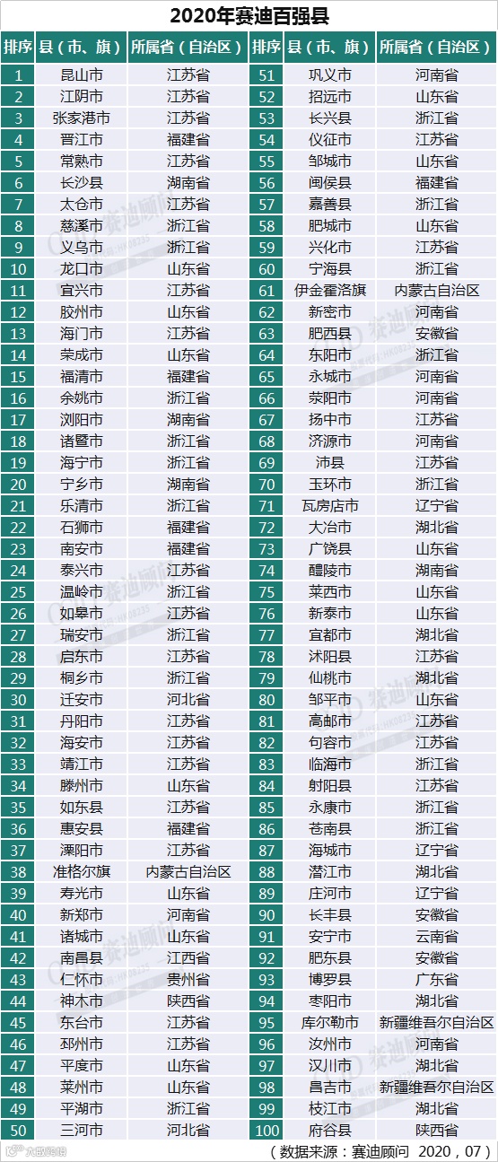 根据赛迪顾问近日发布的《2020中国县域经济百强研究》(下称“报告”),百强县中GDP(2019年,下同)千亿县域突破33个;此外,百强县人均GDP达到11.09万元,远超全国平均水平,已达到高收入国家水平。从区域上来看,百强县中68个县域位于我国东部沿海地区,多处于长三角、京津冀和粤港澳大湾区等城市群周边。