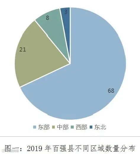 从区域分布看,百强县整体上呈现东多西少的趋势,其中东部地区占68席,约七成;中部地区占21席,约两成;西部地区稳中有进,占据8个席位;东北地区保持平稳,保持3个席位。与2019年相比,东部地区席位减少3位,中部地区增加2席,西部地区增加1席位。