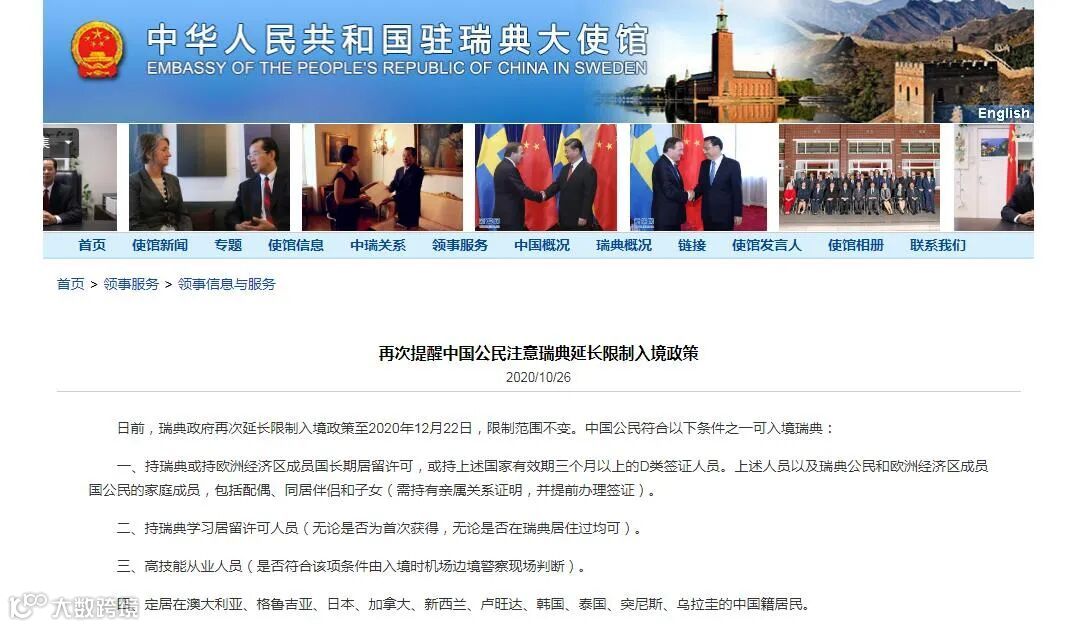 中国驻瑞典使领馆提醒中国公民,当前新冠肺炎疫情仍在发展中,应尽量减少国际旅行。如确需来瑞,请务必提前了解相关政策,同在瑞家属、就读学校或雇主确认,做足准备,避免因无法入境造成滞留或遣返。