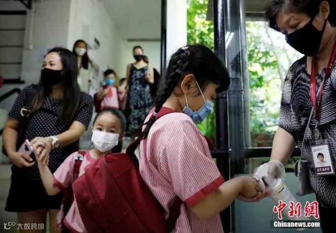 图为当地时间11月2日,新加坡学校重新开学,幼儿园学生进教室前用洗手液消毒。