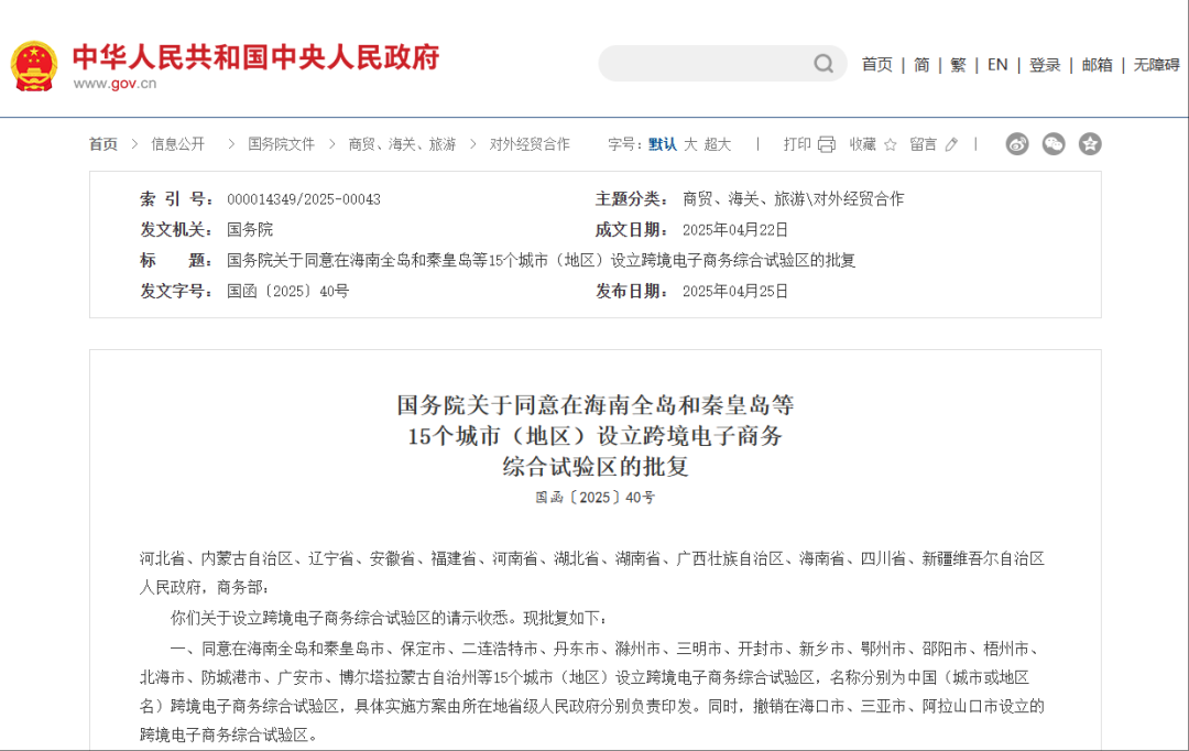 《国务院关于同意在海南全岛和秦皇岛等15个城市(地区)设立跨境电子商务综合试验区的批复》今日(25日)发布。