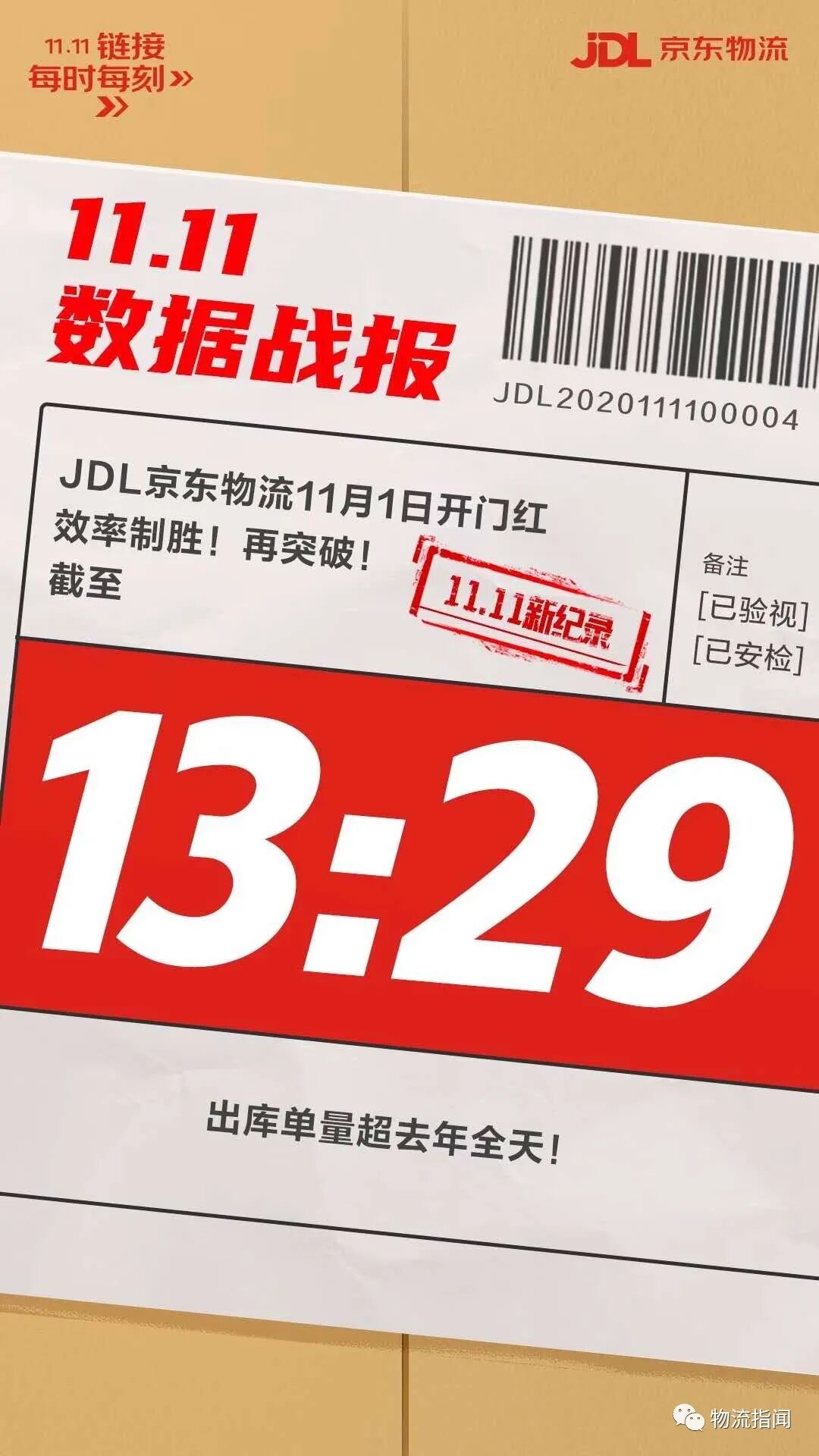 再次刷新记录!JDL京东物流11.11开门红,截至13点29分出库量已超去年全天