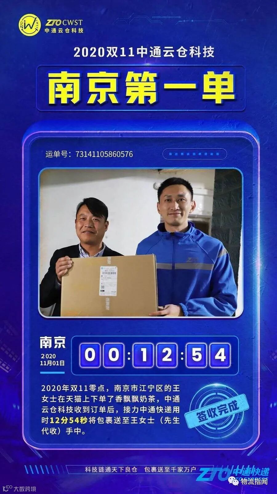 12分54秒,再次刷新中通云仓双十一速度!南京市江宁区王先生11月1日凌晨零点刚下单的香飘飘奶茶商品,5分钟后,包裹已从中通云仓打包出库,凌晨零点12分54秒,包裹成功签收。